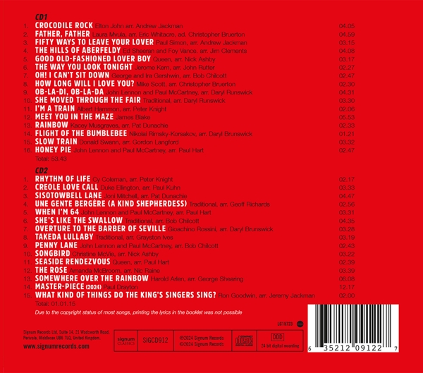 Disc 02 01. King's Singers, The "Rhythm of Life" 02. King's Singers, The "Creole Love Call" 03. King's Singers, The "Sisotowbell Lane" 04. King's Singers, The "Une gente berg?re" 05. King's Singers, The "When I'm 64" 06. King's Singers, The "She's like the swallow" 07. King's Singers, The "Overture to The Barber of Seville" 08. King's Singers, The "Takeda Lullaby" 09. King's Singers, The "Penny Lane" 10. King's Singers, The "Songbird" 11. King's Singers, The "Seaside Rendezvous" 12. King's Singers, The "The Rose" 13. Misha Mullov-Abbado "Somewhere Over the Rainbow" 14. King's Singers, The "Master-piece (2024)" 15. King's Singers, The "What kind of things do The King's Singers sing?"