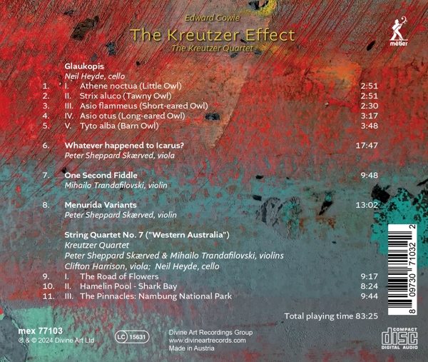 | Beschreibung: | Considered one of the most influential composers inspired by the natural world, Edward Cowie's collaboration with the exceptional Kreutzer String Quartet spans nearly a decade. This partnership has resulted in the recording of Cowie's first six quartets, as well as remarkable solo and duo works showcasing the quartet's unparalleled skill. Now, Cowie presents his seventh string quartet, "Western Australia," specially crafted for the Kreutzer Quartet, accompanied by four solo portrait pieces dedicated to each member. From the ethereal heights of Clifton Harrison's viola to the intricate melodies inspired by the habits of owls for Neil Heyde's cello, Cowie's compositions reflect a profound reverence for both the human animal and the natural world. Delving into the heart of Australia's rugged landscape, Cowie's quartet captures the awe-inspiring vastness and ancient beauty of Western Australia. Each movement paints a vivid picture of the region's diverse landscapes, from the expansive horizons of the first movement to the primal origins depicted in the second, culminating in the mysterious allure of the Pinnacles in the final movement. Through his music, Cowie masterfully evokes the ever-changing landscapes and intricate ecosystems of Western Australia, inviting listeners on a transformative journey through time and space. Additionally, the recording features four solo portraits, each a testament to the unique talents and personalities of the Kreutzer Quartet members. From Neil Heyde's emotive exploration of owls to Mihailo Trandafilovski's evocative interpretation of evolution, Cowie's compositions showcase the quartet's versatility and virtuosity. With each note, Cowie pays homage to his collaborators, celebrating their friendship and artistic prowess while pushing the boundaries of contemporary chamber music. Experience the extraordinary fusion of nature and music in Cowie's latest masterpiece, a testament to the enduring power of creative collaboration and the boundless wonders of the natural world. The Kreutzer Quartet has established itself as one of the most sought-after string quartets in the UK. They appear regularly at the major London venues and have made many live and studio recordings for the BBC, and major networks all over Europe. They have taken their extremely eclectic programmes to Italy, Germany, France, Holland, Serbia, Montenegro, Sardinia, the US, Spain, Cyprus, Poland, and Lithuania. Recent critical and publicly acclaimed performances have been at the Warsaw Autumn Festival, de Doelen, Rotterdam, Quartet 2000, Manchester International, and the Vilnius Philharmonic Festival., Runningtime: 00:00:00, Labelcode METI77103.2 |