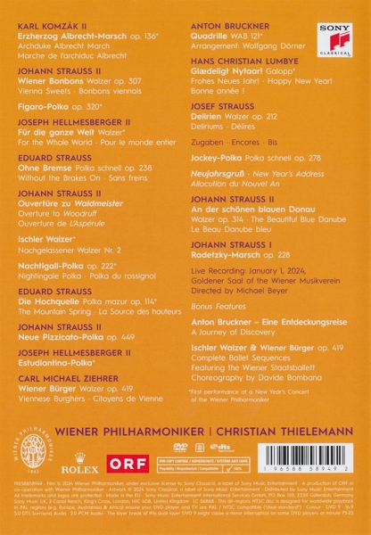 Beschreibung: | The annual New Year's Day Concert in Vienna has been a major event for more than eight decades, since 1939, being broadcast on TV and radio and reaching millions of viewers in over 90 countries across the globe. The concert has previously been conducted by world-famous maestros such as Herbert von Karajan, Lorin Maazel, Claudio Abbado, Carlos Kleiber, Zubin Mehta, Riccardo Muti, Nikolaus Harnoncourt, Seiji Ozawa, Mariss Jansons, Franz Welser-Möst, Gustavo Dudamel and others. The Vienna Philharmonic, as musical ambassadors of Austria, send people all over the world a New Year's greeting in the spirit of hope, friendship and peace with the lively and light-hearted and at the same time nostalgic and profound music from the vast repertoire of the family of Johann Strauss and it's contemporaries., There are few concerts in the world that are awaited with as much excitement as the New Year's Concert from Vienna. Under the direction of Christian Thielemann, the Vienna Philharmonic ushers in the New Year with a concert in the magnificent Golden Hall of the Vienna Musikverein. After 2019, the concert on January 1st marks the 2nd time that Christian Thielemann conducts this prestigious concert event. This year's program includes a total of 9 New Year's Concert Day Premieres, among them music from the Strauß family and its contemporaries. For the first time, there will be music by Anton Bruckner featured on the program - a tribute to the composer's 200th birth anniversary in 2024. The annual New Year's Day Concert in Vienna has been a major event for more than eight decades, since 1939, being broadcast on TV and radio and reaching millions of viewers in over 90 countries across the globe. The concert has previously been conducted by world-famous maestros such as Herbert von Karajan, Lorin Maazel, Claudio Abbado, Carlos Kleiber, Zubin Mehta, Riccardo Muti, Nikolaus Harnoncourt, Seiji Ozawa, Mariss Jansons, Franz Welser-Möst, Gustavo Dudamel and others. The Vienna Philharmonic, as musical ambassadors of Austria, send people all over the world a New Year's greeting in the spirit of hope, friendship and peace with the lively and light-hearted and at the same time nostalgic and profound music from the vast repertoire of the family of Johann Strauss and its contemporaries. TRACK LISTING:Erzherzog Albrecht-Marsch, Op. 136 Wiener Bonbons, Walzer, Op. 307 Figaro-Polka, Op. 320 Für die ganze Welt, Walzer Ohne Bremse, Polka schnell, Op. 238 Waldmeister: Ouvertüre Ischler Walzer Nachtigall-Polka, Op. 222 Die Hochquelle, Polka mazur, Op. 114 Neue Pizzicato-Polka, Op. 449 Estudiantina-Polka Wiener Bürger, Walzer, Op. 419 Quadrille, WAB 121 (Arr. for Orchestra by Wolfgang Dörner) Glædeligt Nytaar! Delirien, Walzer, Op. 212 Track 7 Track 8 Track 9 Track 10 Neujahrskonzert 2024 / New Year's Concert 2024 DVD, Runningtime: 00:00:00, Labelcode SCLL885894DVD |