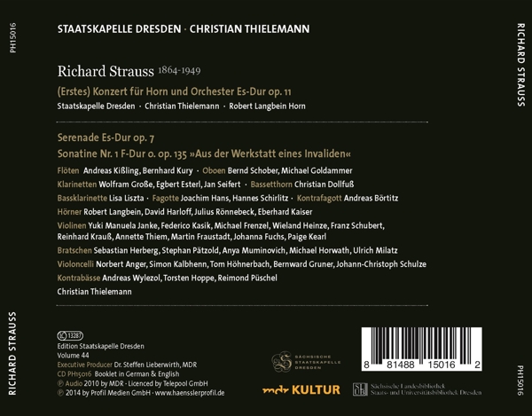 Beschreibung:The way Richard Strauss spoke of his "beloved Dresdeners" rang of Bavarian humor blended with a subtle touch of mischievous irony and, first and foremost, a good dose of respect and appreciation. Home to the Königliche musikalische Kapelle ("Royal Musical Ensemble") and the Court Opera, Dresden soon became a center of Strauss's music; many of his works were given their premiere there. Ernst von Schuch, Strauss's "most loyal conductor of choice", was a key figure: at the symphony concerts given by the Kapelle, the Dresden General Music Director soon acquainted audiences with all of Strauss's tone poems, from Till Eulenspiegels lustige Streiche through Also sprach Zarathustra to Sinfonia domestica. Strauss enthused that, years later, it was "the brilliant Schuch's untiring magic wand" that eventually opened the series of "exemplary premieres" of his operas in Dresden. Works including Salome, Elektra and Der Rosenkavalier made Strauss the leading musical dramatist of his time. He had no fewer than nine operas premiered in Dresden, his "Eldorado for premieres", and dedicated the Alpine Symphony to the Dresden Kapelle as a token of his gratitude. The present release is the 44th volume in the Staatskapelle Dresden's exploration of Strauss's work, and includes, most notably, his Konzert fur Horn und Orchester op. 11., Runningtime: 00:00:00, Labelcode PROL15016.2