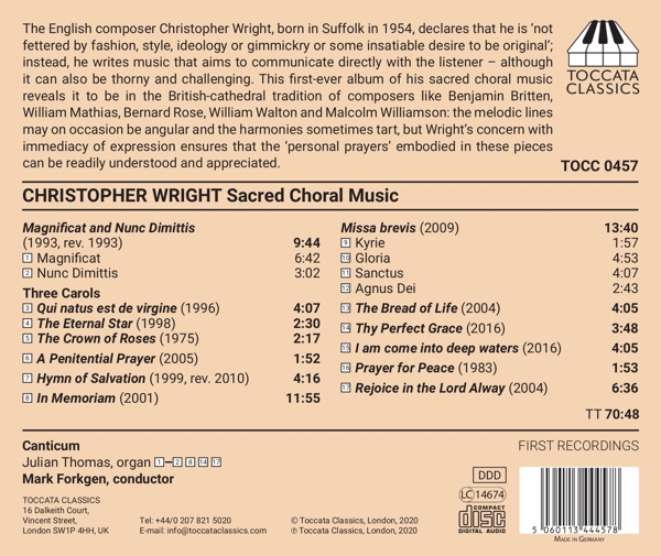 | Beschreibung: | The English composer Christopher Wright, born in Suffolk in 1954, declares that he is 'not fettered by fashion, style, ideology or gimmickry or some insatiable desire to be original'; instead, he writes music that aims to communicate directly with the listener - although it can also be thorny and challenging. This first-ever album of his sacred choral music reveals it to be in the British-cathedral tradition of composers like Benjamin Britten, William Mathias, Bernard Rose and Malcolm Williamson: the melodic lines may on occasion be angular and the harmonies sometimes tart, but Wright's concern with immediacy of expression ensures that the 'personal prayers' embodied in these pieces can be readily understood and appreciated., Runningtime: 00:00:00, Labelcode TCCT457.2 |