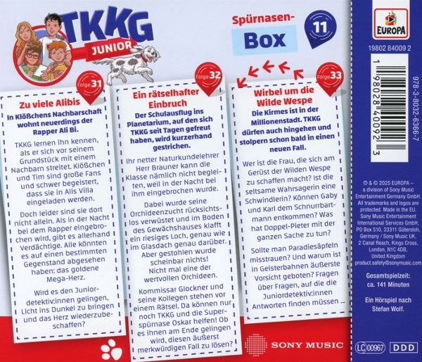Die "Spürnasen-Box 11 (Folgen 31,32,33)" ist eine spannende Hörspiel-CD-Sammlung aus der beliebten Kinderkrimi-Reihe TKKG Junior. Diese Box enthält drei aufregende Abenteuer und lädt junge Hörer dazu ein, gemeinsam mit Tim, Karl, Klößchen und Gaby knifflige Fälle zu lösen ? voller Witz und Mut! Jede Folge bietet fesselnde Geschichten mit cleveren Rätseln sowie wertvolle Botschaften über Freundschaft und Teamgeist ? ideal für alle Kinder abenteuerlicher Detektivgeschichten lieben. Die hochwertige Produktion garantiert Hörspaß für die ganze Familie.