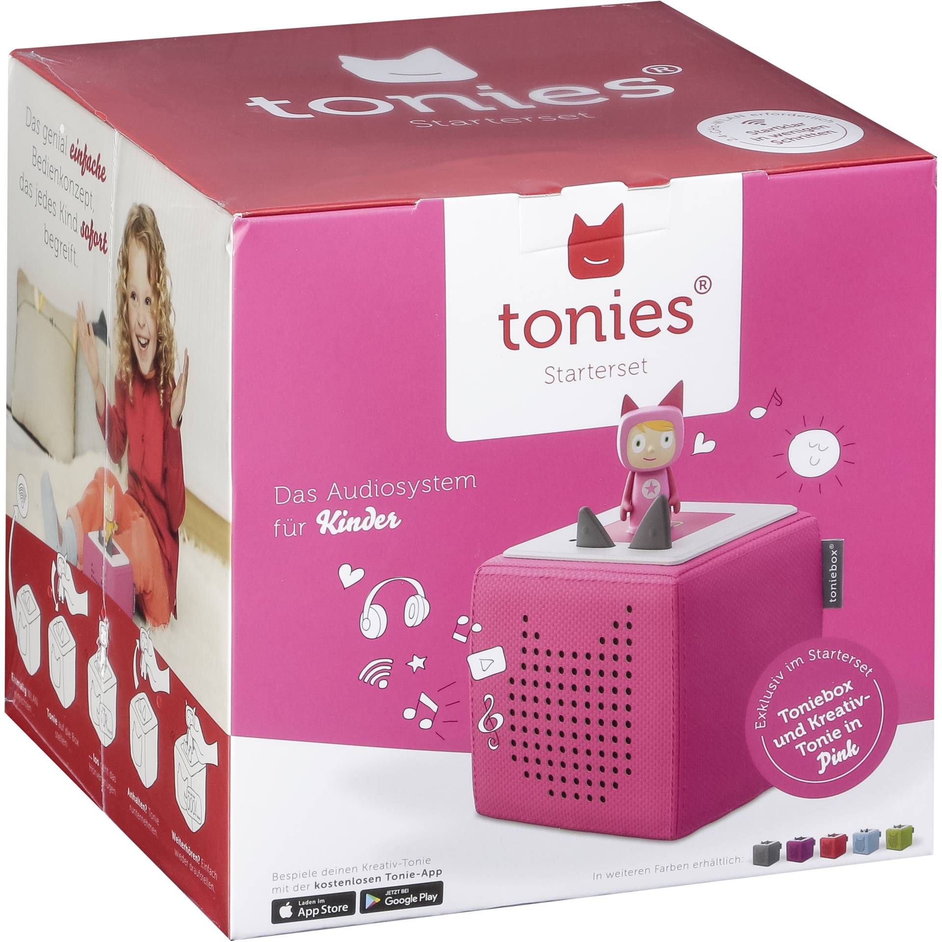 | Beschreibung: | Steige ein in das neue Hör- und Spielerlebnis - mit dem tonies Starterset Einfach auspacken und sofort loslegen! Das steckt alles drin im Karton: - Eine Toniebox in deiner gewählten Farbe - Ein exklusiver Kreativ-Tonie in der Toniebox-Farbe - Eine Ladestation zum Aufladen deines Toniebox-Akkus - Eine leicht verständliche BedienungsanleitungSteige ein in das neue Hör- und Spielerlebnis - mit dem tonies® Starterset Einfach auspacken und sofort loslegen! Um das tonies® Audiosystem zu nutzen, brauchst du ein 2,4 GHz b/g/n WLAN mit Internetzugang sowie ein internetfähiges Endgerät (Smartphone, Tablet oder PC) für die Erstinbetriebnahme. Um Kreativ-Tonies bespielen zu können, brauchst du zudem ein Toniecloud Kundenkonto. Dort verwaltest du die Inhalte, die du mit deinem Kreativ-Tonie verknüpfen möchtest. Die Registrierung für dein Kundenkonto ist kostenlos. Last but not least empfehlen wir dir, unsere kostenlose Smartphone App herunterzuladen (erhältlich für iOS ab Version 9 und Android ab Version 4.4 (KitKat). Mit dieser App kannst du deine eigenen Sprachaufnahmen aufzeichnen und deinen Kreativ-Tonies zuweisen. Auch Freunde oder Verwandte kannst du einladen, Inhalte für deine Tonies aufzunehmen. Du hast dabei stets die Kontrolle, wer auf welchen Tonie zugreifen kann. Eine Toniebox in deiner gewählten Farbe Ein exklusiver Kreativ-TonieDas Starterset Pink (Toniebox + Kreativ-Tonie) von Tonies ist der ideale Einstieg in eine faszinierende Hörspielwelt für Kinder ab drei Jahren. Im Set enthalten sind die innovative Toniebox im auffälligen Pink und ein Kreativ-Tonie zum Selbstbespielen mit eigenen Geschichten oder Liedern ? ganz ohne Bildschirm und komplizierte Technik! Die Bedienung erfolgt kinderleicht durch Berührung und das Aufsetzen der Figuren dank moderner NFC-Technologie; schon startet das Hörabenteuer automatisch. Die robuste Box bietet bis zu 7 Stunden Akkulaufzeit sowie gepolsterte Ecken für maximale Sicherheit im Kinderzimmer und unterwegs. Über WLAN lassen sich neue Inhalte herunterladen; einmal gespeichert können sie auch offline abgespielt werden. Eltern schätzen zudem die Lautstärkebegrenzung und automatische Abschaltfunktion für unbedenklichen Hörspaß.