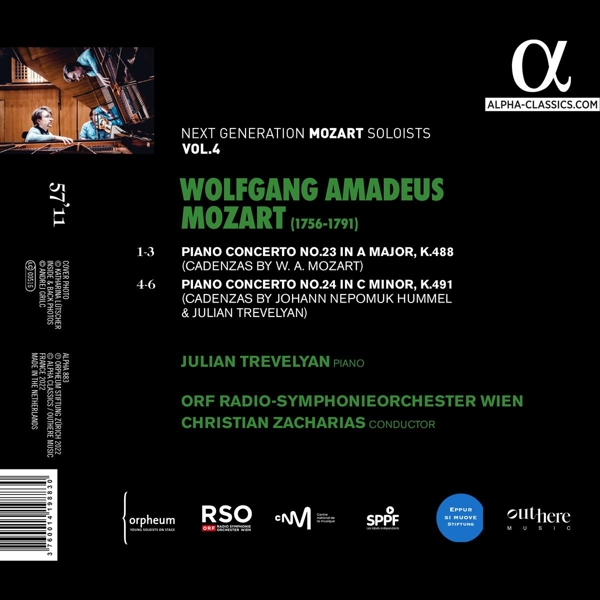 Beschreibung:For the fourth volume in this collection dedicated to Mozart concertos by the younger generation of performers, the Orpheum Foundation and Alpha Classics present the Concertos nos. 23 and 24 (K488 & 491) performed by the British pianist Julian Trevelyan, who was awarded three prizes at the Géza Anda Competition in Zurich in 2021 and, at the age of sixteen, became the youngest-ever prizewinner at the Marguerite Long Competition in Paris in 2015. 'Mozart's music is full of life, humor and enjoyment. My life wouldn't feel fulfilled if I didn't have his music', says the young musician, who is accompanied here by one of the most eminent Mozartian maestros, Christian Zacharias, conducting the ORF Vienna Radio Symphony Orchestra., Runningtime: 00:00:00, Labelcode ALLP883.2