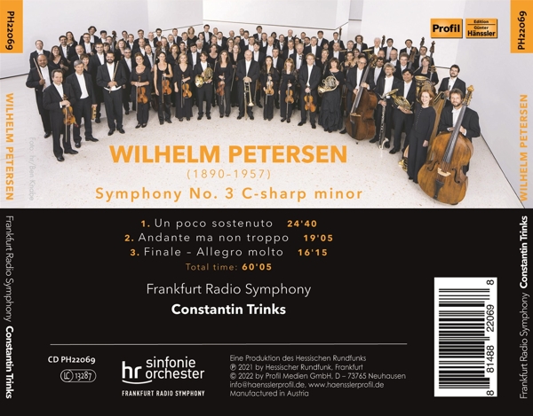 | Beschreibung: | Petersen's Third Symphony in C sharp minor received it's premiere in 1934 under the baton of Karl Friderich in Darmstadt; a further performance followed on September 24, 1935, under Hermann Abendroth in Berlin. The present recording is the first to have been made of this work. Petersen wrote a short factual commentary on his Third Symphony for the September 1935 issue of the Zeitschrift für Musik. Only in a few places does the text depart from a dispassionate sequence of events and indicate the "content" of the music, with such terms as "tragic climax", "breakdown", "tender transfiguration"., Runningtime: 00:00:00, Composed By: Wilhelm Petersen, Conductor: Constantin Trinks, Orchestra: hr-Sinfonieorchester, Labelcode PROL22069.2 (PH22069) |