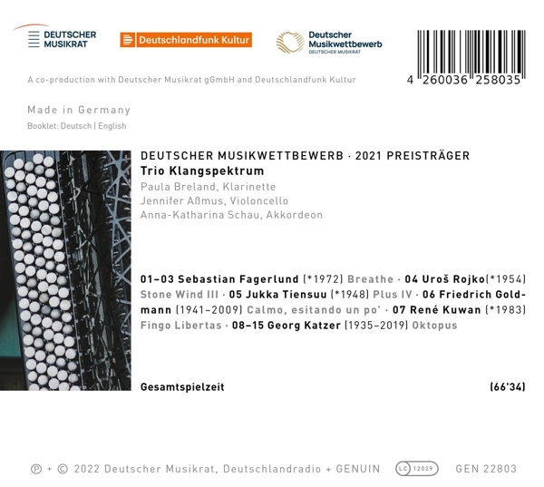 Beschreibung:An unusual trio, winners of the German Music Competition in the "New Music" category, presents the new GENUIN album Breathe. Paula Breland (clarinet), Jennifer Aßmus (violoncello) and Anna-Katharina Schau (accordion) make up the Trio Klangspektrum - a confluence of instruments that, despite their significant differences, are nevertheless all "breathing" instruments. This is reflected both in the organic music-making style of the young musicians and in their selection of lively works of contemporary music. The program includes music by Katzer, Kuwan, Goldmann, Tiensuu, Rojko, and Fagerlund - examples of how new music can narrate stories passionately and sensually., Runningtime: 00:00:00, Composed By: Friedrich Goldmann, Composed By: Georg Katzer, Composed By: Jukka Tiensuu, Composed By: René Kuwan, Composed By: Sebastian Fagerlund, Composed By: Uro? Rojko, Ensemble: Trio [k l a ? ? p ? k t r ? m], Labelcode GENN22803.2 (GEN 22803)