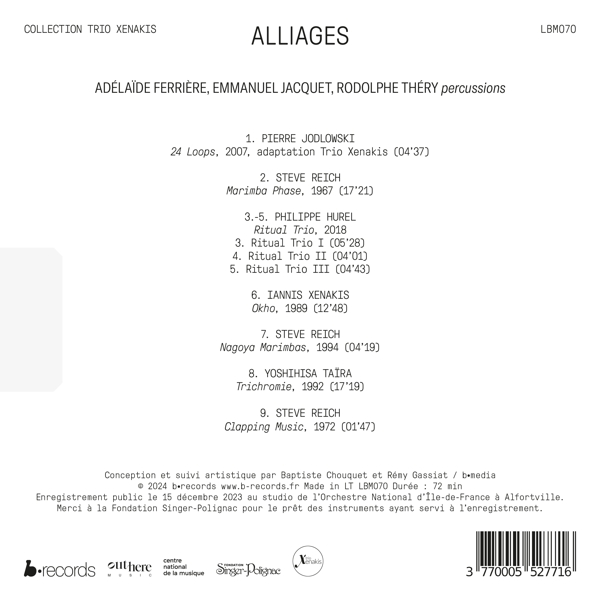 For it's first album, the Trio Xenakis offers a vast panorama of it's favourite repertoire. From Steve Reich to Philippe Hurel, this atlas of percussion is the result of years of experimentation with timbre and resonance., Runningtime: 00:00:00, Labelcode BECS70.2