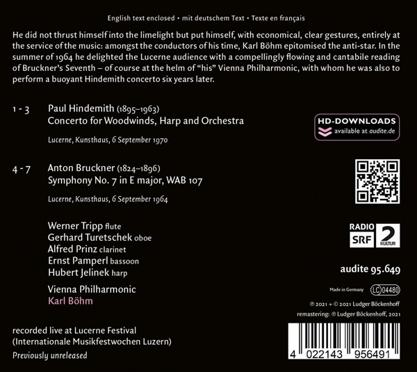Beschreibung:Between 1950 and 1980, he was one of the most important conductors of international standing, and yet he has been somewhat forgotten: Karl Böhm was the antistar among the podium greats of his time, a decidedly businesslike servant of the music. For the first time, two Lucerne concert recordings with the Vienna Philharmonic, with whom he was closely associated for decades, are released: Bruckner's Seventh Symphony and - a solitaire in Böhm's discography - an upbeat Hindemith concerto. In the summer of 1970, Böhm, by all means an advocate of contemporary music in his younger years, performed Paul Hindemith's 1949 Concerto for Woodwinds, Harp and Orchestra in Lucerne. The three-movement work offers the five-member Concertino group grateful playing tasks and, with it's quotation from Mendelssohn's Wedding March, makes reference to Hindemith's own silver wedding anniversary. In addition to Mozart, Beethoven, Schubert, Brahms, and Strauss, the symphonies of Anton Bruckner were also central to Böhm's concert repertoire. Böhm's Bruckner interpretations possess an aura, but it is neither the religiously pathos-laden one of Eugen Jochum, nor the pathetically worldly one of Sergiu Celibidache, nor the matter-of-factly austere one of Nikolaus Harnoncourt. This is also evident in the Lucerne recording of the Seventh Symphony from September 1964: Böhm never loses sight of the whole and yet plays out every articulatory detail with almost scrupulous fidelity to the text. He follows Bruckner's blocky editing technique without aggressively emphasizing it. He does not avoid the music's solemn monumentality, but neither does he exaggerate it into false, violent pathos., Runningtime: 00:00:00, Labelcode AUDT95649.2