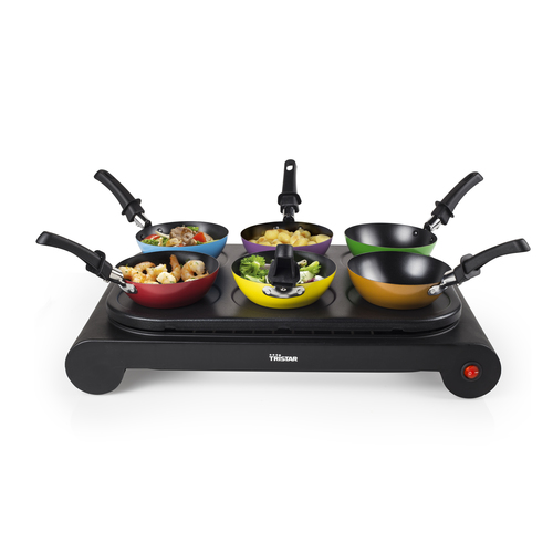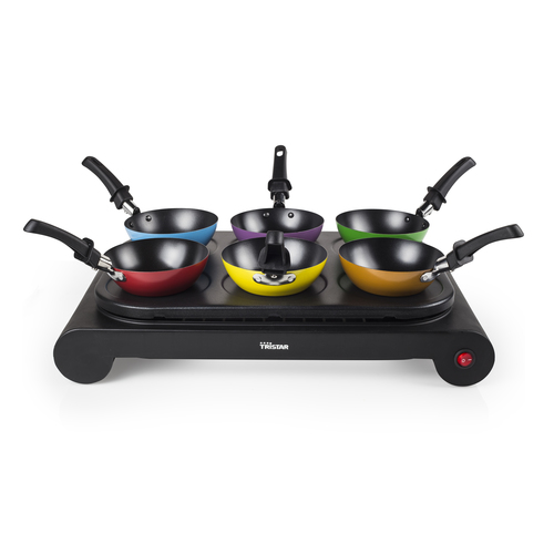 Das Tristar BP-2827 Wokset ist ein vielseitiges und farbenfrohes Küchengerät für bis zu sechs Personen ? ideal für Familienessen oder gesellige Abende mit Freunden. Mit einer starken Leistung von 1000 Watt sorgt das Gerät für schnelles und gleichmäßiges Garen aller Zutaten. Das großzügige Kabel von zwei Metern Länge ermöglicht eine flexible Platzierung auf dem Tisch; die große Fläche (400 mm x 270 mm) bietet ausreichend Raum zum Kochen verschiedener Speisen gleichzeitig. Jeder Gast kann in seiner eigenen Mini-Wokpfanne individuelle Gerichte zubereiten ? perfekt für asiatische Spezialitäten oder kreative Kochideen! Die Antihaftbeschichtung erleichtert die Reinigung und verhindert Anbrennen der Speisen erheblich. Der Hersteller Tristar steht seit Jahren für preiswerte und zuverlässige Haushaltsgeräte mit benutzerfreundlicher Bedienung. Nachhaltigkeit wird bei Tristar großgeschrieben: Energieeffiziente Produktionsprozesse sowie der Einsatz recycelbarer Materialien tragen dazu bei, dass Sie beim Kauf dieses Produkts einen Beitrag zum Umweltschutz leisten können.