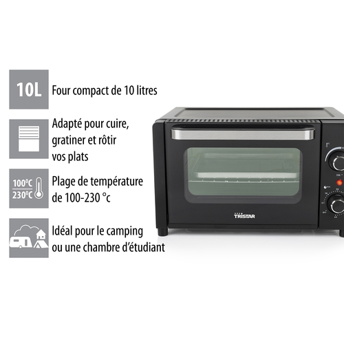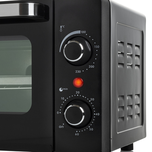 Dieser kompakte Ofen mit 10 Liter Fassungsvermögen eignet sich zum Grillen, Backen und Toasten. Der Ofen ist mit einer oberen und unteren Heizzone ausgestattet und wird mit einem 60-Minuten-Timer betrieben. Geeignet für den Campinggebrauch. Hauptmerkmale Merkmale Netto-Ofenvolumen 10 l Produktfarbe Schwarz Geräteplatzierung Freistehend Steuerung Drehregler Eingebautes Display Nein Thermostatbereich 100 - 230 °C Timer Ja Timer-Typ Mechanisch 99-Minuten-Timer 60 min Backblechgriff Ja Anzahl der Glastür Paneele 2 Türmaterial Glas Rutschfeste Füße Ja Kochfunktionen und -programme Heißluftbetrieb Ja Rotisserie Nein Grill Ja Dampfgaren Nein Konventionelle Beheizung (Ober-/Unterhitze) Nein Abtaufunktion Nein Aufwärmfunktion Nein Warmhaltefunktion Nein Backfunktion Ja Leistung Ofenleistung 800 W Gewicht und Abmessungen Innenmaße (B x T x H) 250 x 165 x 220 mm Lieferumfang Betriebsanleitung Ja Backblech Ja Grillrost enthalten Ja Logistische Daten Menge pro ISO Container (20 Fuß) 830 Stück(e) Menge