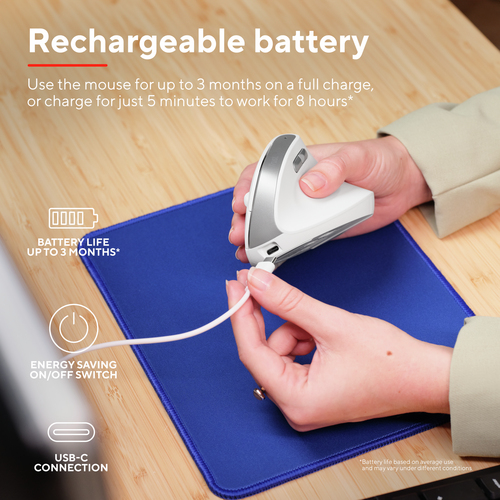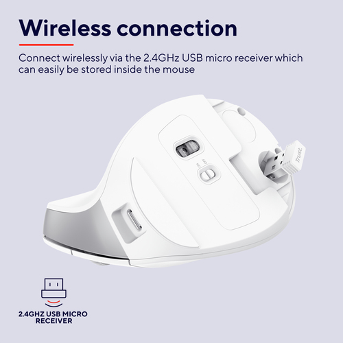 Verpackungsdaten | | Menge pro Packung | 1 Stück(e) | | AC-Netzadapter | Nein | | Verpackungsart | Box | Systemanforderung | | Unterstützt Windows-Betriebssysteme | Windows 10, Windows 11 | | Unterstützt Mac-Betriebssysteme | Mac OS X 12.0 Monterey, Mac OS X 13.0 Ventura, Mac OS X 14.0 Sonoma | | Unterstützung anderer Betriebsysteme | ChromeOS | Sonstige Funktionen | | Garantiezeit | 2 Jahr(e) | Maus | | Zweck | Büro | | Übertragungstechnik | Kabellos | | Geräteschnittstelle | RF Wireless | | Bewegungerfassungs Technologie | Optisch | | Bewegung Auflösung | 2400 DPI | | Scroll Typ | Rad | | Knopfanzahl | 6 | | Anzahl der Scroll-Rollen | 1 | | Scroll-Richtungen | Senkrecht | | Tastentyp | Gedrückte Tasten | | Anpassbare Bewegungsauflösung | Ja | | Anzahl der Bewegungsauflösungsmodi | 4 | | Frequenzband | 2.4 GHz | Lieferumfang | | Receiver enthalten | Ja | | Kabelloser Receiver-Anschluss | USB Typ-A | | Receiver Typus | Mikro-Empfänger | Ergonomie | | Ein-/Ausschalter | Ja | | Kabellose Reichweite | 10 m | Energie | | Energiequelle | Batterien / Kabel | | USB Typ-C Ladeport | Ja | | Wiederaufladbar | Ja | | Akku-/Batterietyp | Integrierte Batterie | Design | | Formfaktor | rechts | | Produktfarbe | Weiß | | Intelligentes, ergonomisches Design | Ja | | Vertikale Ausführung | Ja | | Oberflächenfärbung | Einfarbig | | Material(ien) | Acrylnitril-Butadien-Styrol (ABS) | | Fußmaterial | Ultra High Molecular Weight Polyethylene (UPE) |