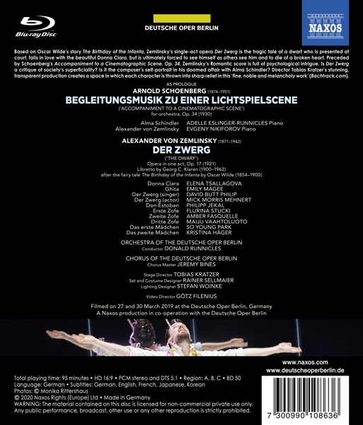 01. (keine Angaben) "Vorpsann" 02. Runnicles, Donald "Begleitmusik zu einer Lichtspielszene op. 34" Der Zwerg (Oper in 1 Akt) (Gesamtaufnahme) 03. Tsallagova, Elena "Flink, faule Kerle, beim Blut des Herrn" 04. Tsallagova, Elena "Das sch?nste Geschenk" 05. Tsallagova, Elena "Das Gras ist warm im sonnigen Schein" 06. Tsallagova, Elena "Wie sch?n sind diese rieselnden Spitzen" 07. Tsallagova, Elena "Die Tollen, sie haben uns alles zerst?rt" 08. Tsallagova, Elena "Die Stunde der Gratulation" 09. Tsallagova, Elena "Der Sultan weiht der Infantin zum Geschenk" 10. Tsallagova, Elena "Was sagt Don Estoban?" 11. Tsallagova, Elena "Trinkt und schlagt die Harfen, Freunde!" 12. Tsallagova, Elena "M?dchen, nimm die blutende Orange" 13. Tsallagova, Elena "Habt ihr's geh?rt?" 14. Tsallagova, Elena "Warum denn flieht mein Freund?" 15. Tsallagova, Elena "Infantin, du musst zum Tanz!" 16. Tsallagova, Elena "Es wird zu arg, wie sie den qu?lt" 17. Tsallagova, Elena "Zwerg! Hofnarr! Ritter!" 18. Tsallagova, Elena "Sag, sahst du nie dich im Spiegel?" 19. Tsallagova, Elena "Seltsam, die Launen des n?rrischen Kindes!" 20. Tsallagova, Elena "Bist du es, feindliches Bild?!" 21. Tsallagova, Elena "Weinst du? Liegst du am Boden" 22. Tsallagova, Elena "Ritter! Ah, er weiß es!" 23. Tsallagova, Elena "Sag, dass es nicht wahr ist" 24. (keine Angaben) "Applaus und Abspann"