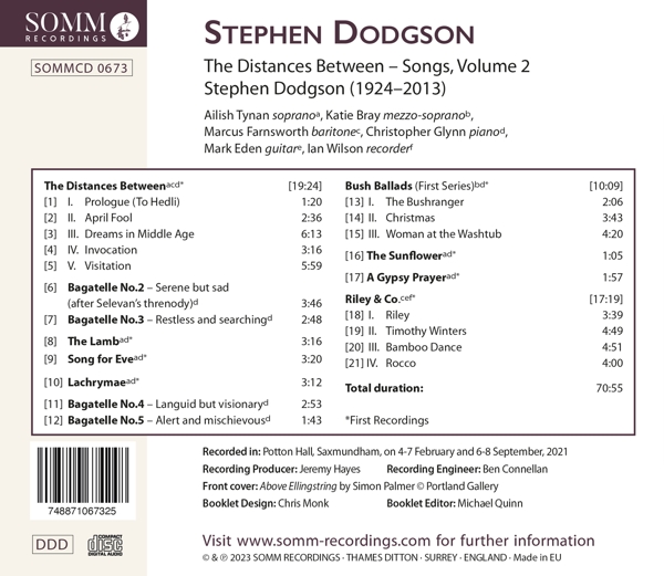 Beschreibung:SOMM Recordings announces The Distances Between, the second volume of songs - including 17 first recordings - by Stephen Dodgson marking the 10th anniversary of his death. The Distances Between features soprano Ailish Tynan, mezzo-soprano Katie Bray and baritone Marcus Farnsworth, accompanied by Christopher Glynn (piano), Mark Eden (guitar) and Ian Wilson (recorder). All but Farnsworth are returning from Volume 1. Son of Symbolist painter John Arthur Dodgson and a distant cousin of Lewis Carroll, Stephen Dodgson was a prolific composer with a notable focus on works for guitar, harpsichord and recorder. His more than 100 overlooked songs are a substantial and defining part of his output. The Distances Between (1969-88), sets five poems by Louis MacNeice - "a 'natural' for music with his keen ear for rhyme and rhythm, his sly verbal colour", Dodgson approvingly wrote - for soprano, baritone and piano. Three songs for mezzo-soprano and piano from the first series of Bush Ballads (1974) are "character songs" taken from Australian poets and marked by sly wit and a rather macabre finale. Setting Charles Causley, Riley & Co. (2009) for baritone, guitar and recorder is a compendium of four pithily told but evocative ballads. Five other solo variegated songs and four preludial piano Bagatelles make much of what Robert Matthew-Walker's informative notes describe as Dodgson's "inherent creative language [and] fluent expressive lines". Volume 1, The Peasant Poet (SOMMCD 0659) was hailed by Opera Today as "an incredibly interesting and engaging disc... done excellent service by all the performers". SOMM's championing of British song includes Stanford's Children's Songs (SOMMCD 0655), "fairly and squarely in the great English song tradition" (MusicWeb International), and Roderick Williams and Susie Allan's Celebrating English Song (SOMMCD 0177), lauded by Gramophone as "a treat", and Somervell's A Shropshire Lass and Maud (SOMMCD 0615), "performances of much beauty, empathy and sensitivity" (British Music Society)., Runningtime: 00:00:00, Labelcode SOMM6740673.2