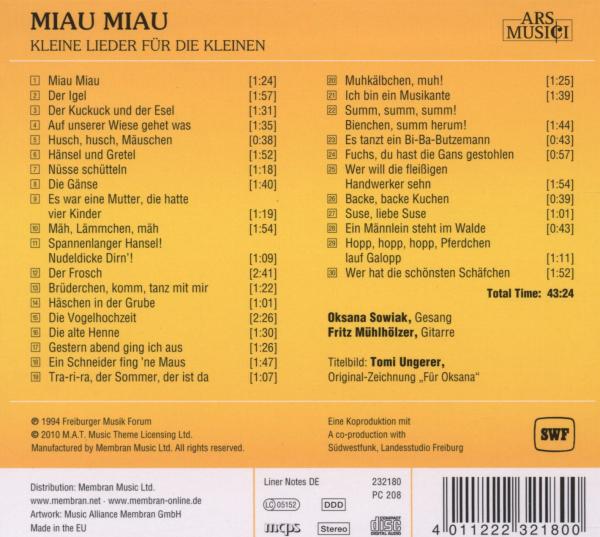 01. "Miau Miau" 02. "Der Igel" 03. "Der Kuckuck und der Esel" 04. "Auf unserer Wiese gehet was" 05. "Husch, husch, M?uschen" 06. "H?nsel und Gretel" 07. "Nüsse schütteln" 08. "Die G?nse" 09. "Es war eine Mutter, die hatte vier Kinder" 10. "M?h, L?mmchen, m?h" 11. "Spannenlanger Hansel! Nudeldicke Dirn'!" 12. "Der Frosch" 13. "Brüderchen, komm, tanz mit mir" 14. "H?schen in der Grube" 15. "Die Vogelhochzeit" 16. "Die alte Henne" 17. "Gestern abend ging ich aus" 18. "Ein Schneider fing 'ne Maus" 19. "Tra-ri-ra, der Sommer, der ist da" 20. "Muhk?lbchen, muh!" 21. "Ich bin ein Musikante" 22. "Summ, summ, summ! Bienchen, summ herum!" 23. "Es tanzt ein Bi-Ba-Butzemann" 24. "Fuchs, du hast die Gans gestohlen" 25. "Wer will die fleißigen Handwerker sehn" 26. "Backe, backe Kuchen" 27. "Suse, liebe Suse" 28. "Ein M?nnlein steht im Walde" 29. "Hopp, hopp, hopp, Pferdchen laut Galopp" 30. "Wer hat die sch?nsten Sch?fchen"