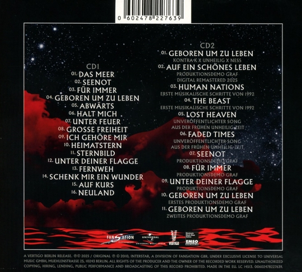 "Grosse Freiheit (Ltd. 15 Jahre Jubiläumsedition)" ist eine besondere Jubiläumsausgabe des ikonischen Albums von Unheilig und erscheint zum 15-jährigen Bestehen dieses Meilensteins als limitierte CD-Edition mit neu gemasterten Songs und exklusivem Bonusmaterial ? ein Muss für Sammler und neue Fans gleichermaßen! Die Band Unheilig um den charismatischen Sänger ?Der Graf? zählt zu den prägendsten Gruppen der Neuen Deutschen Härte sowie der alternativen Rockszene Deutschlands. Mit dem Album ?Grosse Freiheit? gelang ihnen im Jahr 2010 der große Durchbruch: Es hielt sich wochenlang an der Spitze der Charts und erreichte mehrfachen Platinstatus im deutschsprachigen Raum. Ihre tiefgründigen Texte und die eindrucksvolle Bühnenpräsenz machten sie bis zur Abschiedstournee 2016 zu Publikumslieblingen weit über Deutschland hinaus. Das Label Vertigo Berlin steht hinter dieser Veröffentlichung; es ist bekannt dafür, innovative Künstler zu fördern und hat maßgeblich dazu beigetragen, deutsche Musik weltweit erfolgreich zu machen.