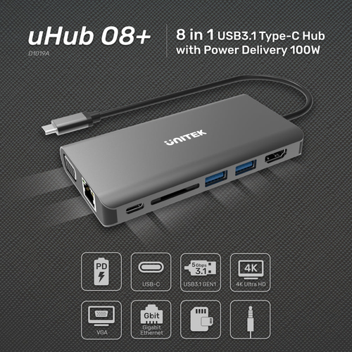 D1019B USB-C Hub 8W1 USB-C 3.1, PD 100W, D1019B (D1019B)