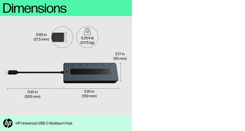 Verpackungsdaten | | Verpackungsbreite | 235 mm | | Verpackungstiefe | 65 mm | | Verpackungshöhe | 45 mm | | Paketgewicht | 179 g | Technische Details | | URL der allgemeinen Produktsicherheitsverordnung (GPSR) | https://support.hp.com/us-en/document/ish_6126692-6126777-16?openCLC=true | | Packungsinhalt | HP Universal USB-C Multiport Hub; Product notice; Warranty | Sonstige Funktionen | | Kompatible Betriebssysteme | Windows 10; Windows 11; macOS; Chrome OS™ | | Spezielle Eigenschaften | 4K capability | | Palettengewicht (imperial) | 248,8 kg | | UNSPSC-Code | 43211609 | Software | | Unterstützt Windows-Betriebssysteme | Windows 10, Windows 11 | | Unterstützt Mac-Betriebssysteme | MacOS | | Unterstützung anderer Betriebsysteme | ChromeOS | Netzwerk | | Ethernet/LAN | Ja | | Anzahl Ethernet-LAN-Anschlüsse (RJ-45) | 1 | | Ethernet LAN Datentransferraten | 10,100,1000 Mbit/s | Markeneigenschaften | | HP GTIN (EAN/UPC) | 196188637197 | Logistikdaten | | Palettengewicht (brutto) | 248,8 kg | Lieferumfang | | Garantiekarte | Ja | Leistungen | | Produktfarbe | Schwarz | | Integrierter Kartenleser | Nein | | Name der Farbe | Black | | Hub-Schnittstellen | DisplayPort, HDMI, RJ-45, USB 3.2 Gen 1 (3.1 Gen 1) Type-A, USB 3.2 Gen 1 (3.1 Gen 1) Type-C | | Ursprungsland | China, Vietnam, Thailand | Gewicht und Abmessungen | | Breite | 150 mm | | Tiefe | 55 mm | | Höhe | 21,5 mm | | Gewicht | 115 g | Energie | | Netzteiltyp | USB | | USB Kabellänge | 0,3 m | Betriebsbedingungen | | Betriebstemperatur | 0 - 35 °C | | Temperaturbereich bei Lagerung | -20 - 60 °C | | Relative Luftfeuchtigkeit in Betrieb | 5 - 90 % | | Luftfeuchtigkeit bei Lagerung | 5 - 95 % | Anschlüsse und Schnittstellen | | Übertragungstechnik | Kabelgebunden | | Hostschnittstelle | USB 3.2 Gen 1 (3.1 Gen 1) Type-C | | Anzahl USB 2.0 Anschlüsse | 0 | | USB 3.2 Gen 1 (3.1 Gen 1) Anzahl der Anschlüsse vom Typ A | 2 | | Anzahl HDMI-Anschlüsse | 1 | | Mikrofon-Eingang | Nein | | Kopfhörerausgänge | 0 | | USB 3.2 Gen 1 (3.1 Gen 1) Anzahl der Anschlüsse vom Typ C | 1 | | USB Power Delivery | Ja | | USB-Stromversorgung bis zu | 65 W | | HDMI-Version | 2.0 | | Anzahl DisplayPort Anschlüsse | 1 | | DisplayPorts-Version | 1.2 |