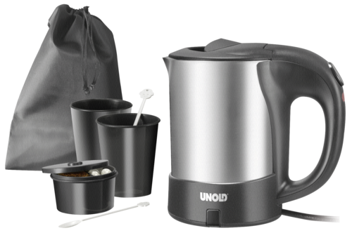 "18575 Edelstahl-Reise-Blitzkocher" von Unold aus der Kategorie Küchengeräte ist Schwarz, Edelstahl und hat die Abmasse von Höhe HÖHE x Breite BREITE x Tiefe 177 mm.