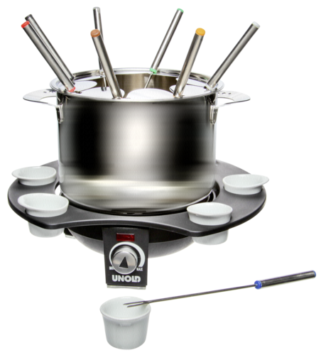 | Allgemeine Daten | | Tiefe in mm | 275 | | Höhe in mm | 216 | | Breite in mm | 296 | | Durchmesser Kochfläche (mm) | 160 | | Farbe | schwarz / silber | | Eigenschaft(en) | | Spülmaschineneignung | abnehmbare Teile spülmaschinengeeignet | | Kontrollleuchte | Ja | | Anzahl Fondue-Gabeln | 8 | | Temperaturregelung | stufenlos | | Leistung (Watt) | 1000 | | Typ(en) | | Typ(en) | Fondue |