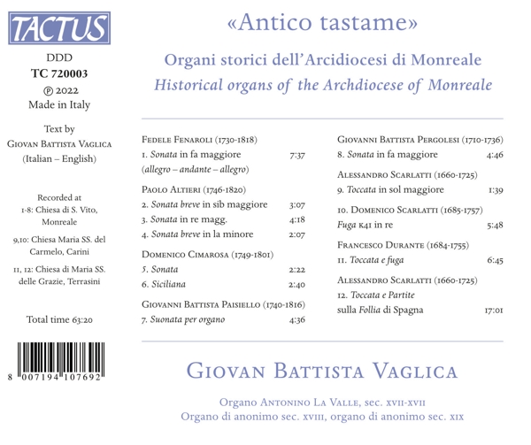 | Beschreibung: | The recording project of organist Giovanni Battista Vaglica aims to enhance the original artistic heritage of the Sicilian Archdiocese of Monreale (Palermo). The territory of Monreale is in fact particularly rich in ancient instruments dating back to the Sicilian school of the eighteenth century, usually small in size and designed mainly for liturgical use. Our care in the choice of the repertoire to be used in this journey through organ music was focused chiefly on the Neapolitan school, on which several generations of musicians coming from the Mediterranean area and elsewhere have drawn and have based their musical education. Within this school, Alessandro and Domenico Scarlatti are two important figures; particularly Alessandro, the father, who decided to move from Palermo to Naples, where he became the teacher of many musicians., Runningtime: 00:00:00, Labelcode TCS720003.2 |