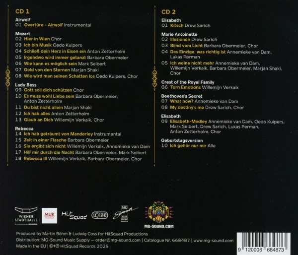 Disc 01 01. Keine Künstlerinformation "Overtüre - Airwolf (Instrumental)" 02. Keine Künstlerinformation "Mozart: Hier in Wien" 03. Kuipers, Oedo "Mozart: Ich bin Musik" 04. Zetterholm, Anton "Mozart: Schließ Dein Herz in Eisen ein" 05. Obermeier, Barbara "Mozart: Irgendwo wird immer getanzt" 06. Seibert, Mark "Mozart: Wie kann es m?glich sein" 07. Shaki, Marjan "Mozart: Gold von den Sternen" 08. Kuipers, Oedo "Mozart: Wie wird man seinen Schatten los" 09. Keine Künstlerinformation "Lady Bess: Gott soll Dich schützen" 10. Obermeier, Barbara / Zetterholm, Anton "Lady Bess: Es muss wohl Liebe sein" 11. Shaki, Marjan "Lady Bess: Du bist nicht allein" 12. Zetterholm, Anton "Lady Bess: Ich hab alles" 13. Verkaik, Willemijn "Lady Bess: Glaub an Dich" 14. Keine Künstlerinformation "Rebecca: Ich hab getr?umt von Manderley" 15. Obermeier, Barbara "Rebecca: Zeit in einer Flasche" 16. Verkaik, Willemijn / Dam, Annemieke van "Rebecca: Sie ergibt sich nicht" 17. Obermeier, Barbara / Seibert, Mark "Rebecca: Hilf mir durch die Nacht" 18. Verkaik, Willemijn / Obermeier, Barbara "Rebecca: Rebecca III"