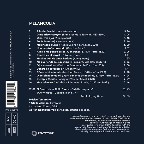 | Beschreibung: | Música Temprana, one of today's most exciting Hispanic early music ensembles, presents it's first PENTATONE album Melancolía, on which they present Spanish courtly songs on mourning and unrequited love around 1500 together with the apocalyptic liturgical tradition of El Canto de la Sibila. Many of the villancicos, canciones, romances and estrambotes performed here have been documented in songbooks such as the famous Cancionero Musical de Palacio. They show the transition from troubadour lyricism to the flourishing Siglo de Oro (Golden Age), and the shift from a medieval to a Renaissance aesthetic in Spanish music. El Canto de la Sibila is a religious tradition that can be traced back as far as St Augustine, who put his contemplation on the end of times into the mouth of a pagan prophetess from Graeco-Roman mythology. Música Temprana's interpretation revives religious practices in 15th-century Cuenca. Altogether, the works performed on this album underline the strong melancholic connections between worldly and religious Spanish musical traditions around 1500, a period full of change and conflict, during which Christian Europe feared the hypothetical end of the world. The extraordinary beauty of these austere works offers solace for our troubled times as well., Runningtime: 00:00:00, Art Direction, Conductor, Tenor Vocals, Vihuela [De Mano], Guitar [Renaissance Guitar], Executive-Producer, Concept By, Liner Notes: Adrian Rodriguez van der Spoel, Baritone Vocals: Romain Bockler, Composed By: Anonymous, Coordinator [Product Coordination]: Veronika Muravskaia, Design: Marjolein Coenrady, Ensemble: Música Temprana, Executive-Producer: Kate Rockett, Harp [Renaissance Harp]: Emma Huijsser, Liner Notes [Text and Lyrics Translation By]: Calvin B. Cooper, Mezzo-soprano Vocals, Liner Notes: Luciana Cueto, Photography By: Patricia Ribas, Product Manager: Kasper van Kooten (2), Project Manager, Handbell [Campanita]: Eelke Bakker, Recorded By: Tom Peeters, Recorded By [Assistant]: Jan van den Bossche (3), Sackbut: Anton Van Houten, Sackbut: Victor Belmonte, Soprano Vocals: Olalla Alemán, Tenor Vocals: Emilio Aguilar (2), Tenor Vocals: Jan van Elsacker, Vihuela [De Arco]: Anna Danilevskaia, Vihuela [De Arco]: Paulina Van Laarhoven, Vocals [Gregorian Chant], Recorder: Andrés Locatelli, Composed By: Francisco de la Torre, Composed By: Adrian Rodriguez van der Spoel, Composed By: Garcimuñós, Soprano Vocals [Serranica]: Olalla Alemán, Composed By: Juan Ponçe, Composed By: Moxica, Composed By: Pedro De Escobar, Composed By: Juan Ponçe, Composed By: Garci Sánchez de Badajoz, Composed By: Adrian Rodriguez van der Spoel, Composed By: Johannes de Urreda, Mezzo-soprano Vocals [Sibila]: Luciana Cueto, Labelcode PNTA5186294.2 (PTC 5186 294), Recorded At Pieterskerk, Utrecht, Phonographic Copyright (p) Música Temprana, Copyright (c) PentaTone Music B.V. |  | Herstellernummer: |