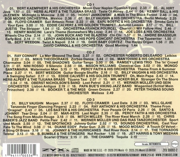 Disc 02 01. Conniff, Ray "LA MER (BEYOND THE SEA)" 02. ORCHESTER ROBERTO DELGARDO "LETKISS" 03. Theodorakis, Mikis "ZORBAS DANCE" 04. MANTOVANI & HIS ORCHESTRA "CHARMAINE" 05. Shadows, The "GUITAR TANGO" 06. RAMSEY LEWIS TRIO "The IN CROWD" 07. Rosso, Nini "IL SILENZIO" 08. Williams, Mason "CLASSICAL GAS" 09. Santamar¡a, Mongo "WATERMELON MAN" 10. PERY FAITH & HIS ORCHESTRA "THEME FROM A SUMMER PLACE" 11. Weedon, Bert "GUITAR BOOGIE SHUFFLE" 12. BILLY VAUGHN & HIS ORCHESTRA "A SWINGING SAFARI" 13. EDDIE CALVERT & HIS GOLDEN TRU "OH, MEIN PAPA" 14. HERB ALPERT & THE TIJUANA BRAS "TIJUANA TAXI" 15. MR. ACKER BILK "STRANGER ON THE SHORE" 16. OBERST NICHOLSON S BAND "LOST PATROL" 17. WERNER M?LLER UND SEIN ORCHEST "LISBON ANTIGUA" 18. PAPA BUE S VIKING JAZZ BAND "WIEGENLIED (SCHLAF MEIN PRINZCHEN)" 19. BOOKER T. & THE MGS "GREEN ONIONS" 20. PETER THOMAS SOUND ORCHESTER "MELISSA"