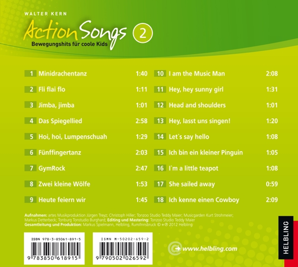 01. Unterberger, Kerem / Walther, Gudrun / Held, Thomas / Kinderchor Der Ev. Stadtkirche Esslingen / Kinder Der MHS Lingenau "Minidrachentanz" 02. Hiller, Christoph / Lorenz, Isabelle / Pohlenz, Adele / Schlegel, Margareta / Thiele, Emma "Fli flai flo" 03. Kinder Der MHS Lingenau "Jimba, jimba" 04. Unterberger, Kerem / Walther, Gudrun / Held, Thomas / Kinderchor Der Ev. Stadtkirche Esslingen / Kinder Der MHS Lingenau "Das Spiegellied" 05. Schicho, Katharina / Strohmeier, Kurt "Hoi, hoi, Lumpenschuah" 06. Unterberger, Kerem / Walther, Gudrun / Held, Thomas / Kinderchor Der Ev. Stadtkirche Esslingen / Kinder Der MHS Lingenau "Fünffingertanz" 07. Hiller, Christoph / Lorenz, Isabelle / Pohlenz, Adele / Schlegel, Margareta / Thiele, Emma "Gym Rock" 08. Hiller, Christoph / Lorenz, Isabelle / Pohlenz, Adele / Schlegel, Margareta / Thiele, Emma "Zwei kleine W?lfe" 09. Nowak, Ronja / Nowak, Ramona / Koch, Lisa / Ritzert, Kathrin "Heute feiern wir" 10. Hiller, Christoph / Lorenz, Isabelle / Pohlenz, Adele / Schlegel, Margareta / Thiele, Emma "I am the music man" 11. Unterberger, Kerem / Walther, Gudrun / Held, Thomas / Kinderchor Der Ev. Stadtkirche Esslingen / Kinder Der MHS Lingenau "Hey, hey sunny girl" 12. Botazzi, Mario "Head and shoulders" 13. Unterberger, Kerem / Walther, Gudrun / Held, Thomas / Kinderchor Der Ev. Stadtkirche Esslingen / Kinder Der MHS Lingenau "Hey, lasst uns singen!" 14. Schicho, Katharina / Strohmeier, Kurt "Let's say hello" 15. Unterberger, Kerem / Walther, Gudrun / Held, Thomas / Kinderchor Der Ev. Stadtkirche Esslingen / Kinder Der MHS Lingenau "Ich bin ein kleiner Pinguin" 16. Botazzi, Mario "I'm a little teapot" 17. Hiller, Christoph / Lorenz, Isabelle / Pohlenz, Adele / Schlegel, Margareta / Thiele, Emma "She sailed away" 18. Hiller, Christoph / Lorenz, Isabelle / Pohlenz, Adele / Schlegel, Margareta / Thiele, Emma "Ich kenne einen Cowboy"