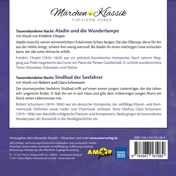 01. Fehn, Gerhard / Seigerschmidt, Florian / Goics, Silvia / Stroh, Valentin / Rau, Almut / +++ "Ein freundlicher Onkel? (Scherzo nr. 2)" 02. Fehn, Gerhard / Seigerschmidt, Florian / Goics, Silvia / Stroh, Valentin / Rau, Almut / +++ "Der schreckliche Zauberer (Revolutionsetüde)" 03. Fehn, Gerhard / Seigerschmidt, Florian / Goics, Silvia / Stroh, Valentin / Rau, Almut / +++ "Die verrostete Lampe ( Etüde nr. 3 in E-Dur)" 04. Fehn, Gerhard / Seigerschmidt, Florian / Goics, Silvia / Stroh, Valentin / Rau, Almut / +++ "Der hilfsbereite Zwerg (Grande Valse brillante)" 05. Fehn, Gerhard / Seigerschmidt, Florian / Goics, Silvia / Stroh, Valentin / Rau, Almut / +++ "Der Geist aus der Lampe (Trauermarsch)" 06. Fehn, Gerhard / Seigerschmidt, Florian / Goics, Silvia / Stroh, Valentin / Rau, Almut / +++ "So bekommt man die Prinzessin! (Minutenwalzer)" 07. Fehn, Gerhard / Seigerschmidt, Florian / Goics, Silvia / Stroh, Valentin / Rau, Almut / +++ "Die List der Zauberers (Regentropfen-Pr?lude)" 08. Fehn, Gerhard / Seigerschmidt, Florian / Goics, Silvia / Stroh, Valentin / Rau, Almut / +++ "Rettung in der letzten Sekunde (Polonaise in As-Dur)" 09. Seeboth, Michael / Thiede, Marvin / Zamperoni, Luca / Logemann, Frank / Kolb, Sebastian / +++ "Sindbad der Seefahrer (Drei Romanzen, Andante)" 10. Seeboth, Michael / Thiede, Marvin / Zamperoni, Luca / Logemann, Frank / Kolb, Sebastian / +++ "Die Insel, die keine war (Rheinische Sinfonie, Scherzo: Sehr massig)" 11. Seeboth, Michael / Thiede, Marvin / Zamperoni, Luca / Logemann, Frank / Kolb, Sebastian / +++ "Das Ei des Vogels Roc (Carnaval, Davidsbündlert?nze)" 12. Seeboth, Michael / Thiede, Marvin / Zamperoni, Luca / Logemann, Frank / Kolb, Sebastian / +++ "Gefangen in eine Tal (Klaviersonate in g-Moll, Rondo)" 13. Seeboth, Michael / Thiede, Marvin / Zamperoni, Luca / Logemann, Frank / Kolb, Sebastian / +++ "Das Grab der Ehem?nner (Soir?es Musicales, Nocturne)" 14. Seeboth, Michael / Thiede, Marvin / Zamperoni, Luca / Logemann, Frank / Kolb, Sebastian / +++ "Ein unheimliches Wesen (Fantasiestücke, Zart und mit Ausdruck)" 15. Seeboth, Michael / Thiede, Marvin / Zamperoni, Luca / Logemann, Frank / Kolb, Sebastian / +++ "Die allerletzte Seereise (Manfred, Ouvertüre)" 16. Seeboth, Michael / Thiede, Marvin / Zamperoni, Luca / Logemann, Frank / Kolb, Sebastian / +++ "Allah prüft jeden Menschen (Frühlingssinfonie, Andante und poco maestoso)"