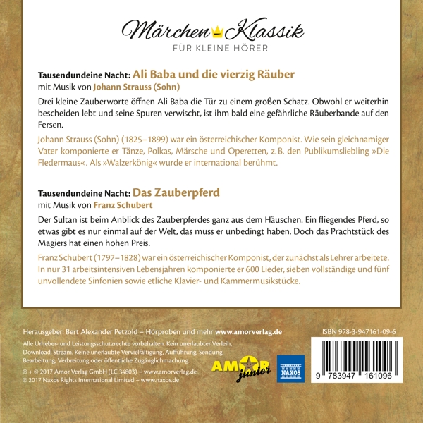 01. L?bbert, Aischa-Lina / Logemann, Frank / Bochr?der, Friedrich / Reske, Anna- Christina / Rahma, Jana / +++ "Ali Baba und die Schatzh?hle (Indigo und die vierzig R?uber, Ouvertüre)" 02. L?bbert, Aischa-Lina / Logemann, Frank / Bochr?der, Friedrich / Reske, Anna- Christina / Rahma, Jana / +++ "Der gierige Bruder (Indigo und die vierzig R?uber, Ouvertüre)" 03. L?bbert, Aischa-Lina / Logemann, Frank / Bochr?der, Friedrich / Reske, Anna- Christina / Rahma, Jana / +++ "Eine seltsame Beerdigung (Eine Nacht in Venedig, Gondellied)" 04. L?bbert, Aischa-Lina / Logemann, Frank / Bochr?der, Friedrich / Reske, Anna- Christina / Rahma, Jana / +++ "Die Wut des R?uberhauptmanns (Es lebe der Ungar!)" 05. L?bbert, Aischa-Lina / Logemann, Frank / Bochr?der, Friedrich / Reske, Anna- Christina / Rahma, Jana / +++ "Zeichen and der Wand (Anna-Polka)" 06. L?bbert, Aischa-Lina / Logemann, Frank / Bochr?der, Friedrich / Reske, Anna- Christina / Rahma, Jana / +++ "Die treue Mardschana (Perpetuum Mobile - ein musikalischer Scherz)" 07. L?bbert, Aischa-Lina / Logemann, Frank / Bochr?der, Friedrich / Reske, Anna- Christina / Rahma, Jana / +++ "Auf Rache aus! (Unter Donner und Blitz)" 08. L?bbert, Aischa-Lina / Logemann, Frank / Bochr?der, Friedrich / Reske, Anna- Christina / Rahma, Jana / +++ "Mardschanas Tanz und Klugheit (An der sch?nen blauen Donau)" 09. Seeboth, Michael / Bergmann, Christian / Stark, Julia Katharina / Schwarz, Emil / Weber, Dominik Paul / +++ "Das wundersch?ne Pferd des Magiers (Sinfonie nr. 5, alegretto vivace)" 10. Seeboth, Michael / Bergmann, Christian / Stark, Julia Katharina / Schwarz, Emil / Weber, Dominik Paul / +++ "Prinz Firus hoch am Himmelszelt (Streichquartett in C-Dur)" 11. Seeboth, Michael / Bergmann, Christian / Stark, Julia Katharina / Schwarz, Emil / Weber, Dominik Paul / +++ "Im Schloss von Pirnzessin Indira (Impromptus nr. 3)" 12. Seeboth, Michael / Bergmann, Christian / Stark, Julia Katharina / Schwarz, Emil / Weber, Dominik Paul / +++ "Persische Hochzeitsvorbereitungen (Forellenquintett)" 13. Seeboth, Michael / Bergmann, Christian / Stark, Julia Katharina / Schwarz, Emil / Weber, Dominik Paul / +++ "Der b?se Magier (Der Tod und das M?dchen, andante con moto)" 14. Seeboth, Michael / Bergmann, Christian / Stark, Julia Katharina / Schwarz, Emil / Weber, Dominik Paul / +++ "Die Prinzessin seltsam in Kaschmir (Die unvollendete, allegro moderato)" 15. Seeboth, Michael / Bergmann, Christian / Stark, Julia Katharina / Schwarz, Emil / Weber, Dominik Paul / +++ "Eine lange Suche (Streichqartett in C-Dur)" 16. Seeboth, Michael / Bergmann, Christian / Stark, Julia Katharina / Schwarz, Emil / Weber, Dominik Paul / +++ "Rettung mit dem Zauberpferd (Rosamunde)"