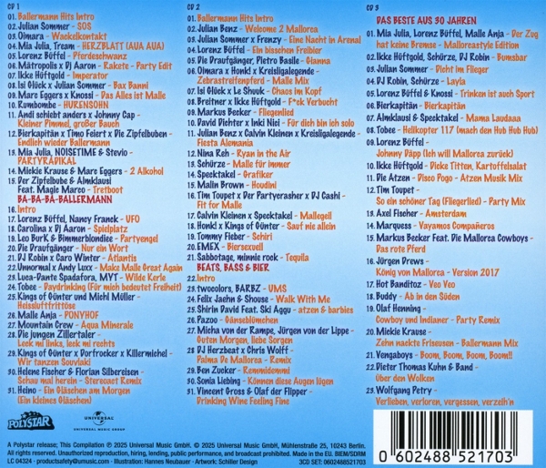 Die "Ballermann Hits 2025 - XXL Jubiläumsversion" ist die ultimative Party-CD für alle Fans von deutschem Schlager-, Pop- und Dance-Sound. Diese besondere Jubiläumsedition vereint die angesagtesten Sommerhits und legendären Klassiker der berühmten Ballermann-Partyszene auf Mallorca. Mit einer energiegeladenen Mischung aus Chartstürmern und zeitlosen Favoriten verschiedener Künstler garantiert diese Compilation ausgelassene Stimmung sowie authentisches Beachclub-Feeling ? egal ob zu Hause oder unterwegs. Die sorgfältig zusammengestellte Trackliste fängt den Geist des Feierns ein und sorgt mit mitreißenden Beats für beste Unterhaltung bei jeder Gelegenheit.