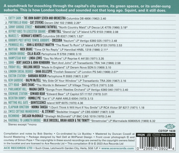 01. Barry, John Seven & Orchestra "Cutty sark" 02. Stevens, Cat "Portobello Road" 03. Faithful, Marianne "Sunny Goodge Street" 04. Jethro Tull "Jeffrey goes to Leicester Square" 05. Herman's Hermits "Marcel's" 06. Cressida "Goodbye Post Office Tower, goodbye" 07. Martyn, John & Beverley "Primrose Hill" 08. Drake, Nick "Mayfair" 09. Black, Cilla "London Bridge" 10. Lewis, Linda "Hampstead Way" 11. Jansch, Bert / Renbourn, John "Soho" 12. Bulldog Breed "Friday Hill" 13. Gillespie, Dana "London social degree" 14. Ruskin, Barbara "Euston Station" 15. McTell, Ralph "Kew Gardens" 16. Evans, Dave "City road" 17. Magna Carta "Parliament Hill" 18. Bear, Edward "Edgware Station" 19. Humble Pie "Beckton dumps" 20. Quintessence "Notting Hill Gate" 21. Tanega, Norma "Clapham Junction" 22. Stewart, Al "Swiss cottage manoeuvres" 23. McDonald, Shelagh "Richmond" 24. Driscoll, Julie / Auger, Brian / Trinity, The "Vauxhall to Lambeth Bridge"