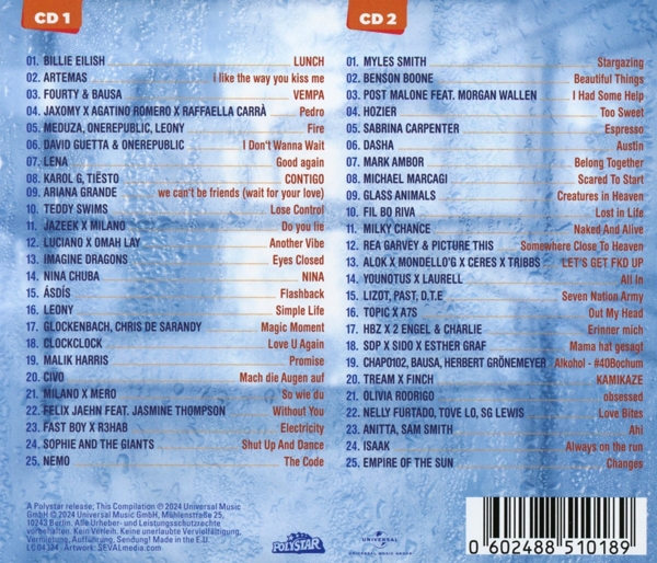 Disc 02 01. Smith, Myles "Stargazing" 02. Smith, Myles "Beautiful Things" 03. Malone, Post "I Had Some Help" 04. Hozier "Too Sweet" 05. Carpenter, Sabrina "Espresso" 06. Dasha "Austin" 07. Ambor, Mark "Belong Together" 08. Marcagi, Michael "Scared To Start" 09. Glass Animals "Creatures in Heaven" 10. Remm, Felix Anton "Lost in Life" 11. Milky Chance "Naked And Alive" 12. Garvey, Rea "Somewhere Close To Heaven" 13. Alok "LET'S GET FKD UP" 14. YouNotUs "All In" 15. LIZOT "Seven Nation Army" 16. Topic "Out My Head" 17. HBz "Erinner mich" 18. SDP "Mama hat gesagt" 19. Chapo102 "Alkohol (#40Bochum)" 20. Tream "KAMIKAZE" 21. Rodrigo, Olivia "obsessed" 22. Furtado, Nelly "Love Bites" 23. Anitta "Ahi" 24. ISAAK "Always on the run (new)" 25. Empire Of The Sun "Changes"