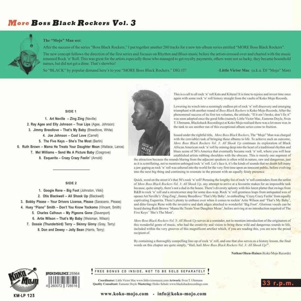 | | Beschreibung: | Vinyl LP pressing. Issued under the rightful title, More Boss Black Rockers, The Mojo Man was charged with the (enviable) task of bringing these albums to life. To achieve such an outcome, More Boss Black Rockers Vol. 3: All Shook Up continues it's exploration of Black African American rock 'n' roll by mining deep into the heart of a traditional rhythm and blues scene of 50's America that eventually became rock 'n' roll, where you will hear established artists rubbing shoulders with the obscure. This is merely one segment of the attraction because the sounds blaring from the adjacent speakers is often wild in nature, raw and dangerous, just as it is scintillating, not to mention unhinged rock 'n' roll. Let's face it, it's the kinds of sounds that no doubt left many a jaw gaping as rock 'n' roll was ushered into the world for the very first time upon an innocent public, before evolving into the next big thing and continuing to resonate in the present with an equally feisty presence. Quick, word on the street it's that 50's rock 'n' roll! Perusing the lengthy list of rock 'n' roll contenders from the setlist of More Boss Black Rockers Vol. 3: All Shook Up, any attempt to arrive at a favourite makes for an impossible task because, quite simply, there's not a dud in the house. There's diversity aplenty with this latest platter that swings from R&B to rock 'n' roll and a streetcorner stop for some doo-wop. Rock 'n' roll greatness leaps from antiquated wax of opener Art Neville's 'Zing Zing', Jimmy Breedlove 'That's My Baby', to enthralling 'Crazy Crazy Feelin' from equally captivating Esquerita. There's plenty to enthuse over when it comes to rockin' Artie Wilson and 'That's My Baby', and ditto Googie Rene with the inventive and dark edges attached to wonderful 'Big Foot'. Glorious vocals can be heard during Ruth Brown 'Mama He Treats Your Daughter Mean', before arriving at no introduction required of The Five Keys' 'She's The Most'. Nathan Olsen-Haines (Koko Mojo Records), Runningtime: 00:00:00, Artwork: Sven T. Uhrmann, Coordinator: Little Victor, Liner Notes: Nathan Olsen-Haines, Mastered By: Heiko Schulz, Music Consultant [Quality Consultant]: Eamonn Doyle (2), Written-By: Art Neville, Written-By: Elly Johnson, Written-By: Ray Agee, Written-By: Jimmy Breedlove, Written-By: Joan White, Written-By: Ed Carrell, Written-By: Murray Berlin, Written-By: Herb Lance, Written-By: Johnny Wallace, Written-By: George Cosgrove, Written-By: Calvin Arnold, Written-By: Buck Johnston, Written-By: Jeanne Vikki, Written-By: Otis Blackwell, Written-By: Bobby Please, Written-By: Joe Saraceno, Written-By: Huey "Piano" Smith, Written-By: John Vincent, Written-By: John Davenport, Written-By: Artie Wilson, Written-By: Ben Weisman, Written-By: Dossie Terry, Written-By: William Gray (3), Written-By: Dewey Terry, Written-By: Don "Sugarcane" Harris, Labelcode KOKM123.1 (KM-LP 123), Record Company Rockstar Records Ltd, Distributed By Broken Silence, Mastered At Black Shack Recordings |  | | Herstellernummer: |