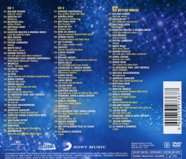 Disc 01 01. Kaiser, Roland "Sag mir wann" 02. Ott, Kerstin "M?dchen" 03. Egli, Beatrice "Volles Risiko" 04. Reim, Matthias "Blaulicht" 05. Walter, Karsten "Lass die anderen reden" 06. Zucker, Ben "Unsere Lieder" 07. Lombardi, Pietro "Vorbei" 08. Kelly, Maite "Was w?re, wenn" 09. Roselly, Ramon "Ich will gern mein Herz verlieren" 10. Stereoact "Hello Again (Stereoact #Remix)" 11. Michelle "Paris (Version 2022)" 12. Jung, Claudia "Tür an Tür (Radio Edit)" 13. DJ ?tzi "Wenn Gott so will (Xtreme Sound Remix)" 14. Liebing, Sonia "Spuren der Liebe" 15. Basile, Pietro "Va bene (Alles was ich will)" 16. Reim, Marie "Das mach ich ohne dich" 17. DJ Herzbeat "Herz Donner" 18. Lais, Christian "So wie Du" 19. Naschenweng, Melissa "Kompliment" 20. Roska, Mathias "Bügel dein Dirndl gscheit auf" 21. Stark, Christin "Ich nicht!" 22. Petry, Wolfgang "Sinn des Lebens" 23. Santiano "Nichts als Horizonte (Rock Mix)" 24. Zucker, Ben "Was ich will, bist du (Ohne dich)"