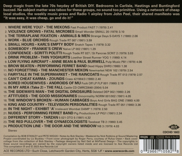 01. Mekons, The "Where were you?" 02. Fatal Microbes "Violence grows" 03. Animals & Men "The terraplane fixation" 04. Blue Orchids "Work" 05. Karl's Empty Body "Small hours" 06. Frankie's Crew "Somebody" 07. Scritti Politti "Confidence" 08. Thin Yoghurts "Drink problem" 09. Bean, Anne / Burwell, Paul "Low flying aircraft" 10. Performing Ferret Band "Brow beaten" 11. Manchester Mekon, The "No forgetting" 12. Raincoats, The "Fairytale in the supermarket" 13. Zounds "Can't cheat karma" 14. Androids Of Mu "Bored housewives" 15. Fall, The "In my area (Take 2)" 16. Digital Dinosaurs, The "The sideways man" 17. Good Missionaries, The "Attitudes" 18. Human Cabbages "The window's broken" 19. Television Personalities "King and country" 20. Exhibit A "In the night" 21. Performing Ferret Band "Nudes" 22. Tarzan "Different story" 23. Gynaecologists, The "The red pullover" 24. The Door And The Widow "Production line"