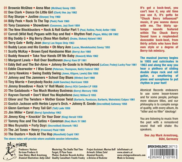 01. McGhee, Brownie "Anna Mae" 02. Clark, Dee "Dance On Little Girl" 03. Sharpe, Ray "Justine" 04. Billy Peek "Rock To The Top" 05. Tony Casanova "Showdown" 06. The New Blockbusters "Rock & Roll Guitar Part 1" 07. Carroll (Wild Red) Pegues Ray and Red And The Bi-Flames "Rhythm Feet" 08. Big Daddy G "Big Berry (Boss Man Guitar)" 09. Terry Gale "Betty Jean" 10. Buddy Lucas And His Combo "Oh Mary Ann" 11. Scotty McKay "Brown Eyed Handsome Man" 12. Buddy Howard "Take Your Hands Off Me Baby" 13. Lewis, Margaret "Roll Over Beethoven" 14. Eddy Bell And The Bel-Aires "Johnny Be-Goode Is In Hollywood" 15. Eddie Clearwater "I Was Gone" 16. Jerry Hawkins "Swing Daddy Swing" 17. Johnny And The Jammers "School Day Blues" 18. Tiny Morrie "Everybody Rocks" 19. Breedlove, Jimmy "Rock'n'Roll Music" 20. The Gadabouts "Too Much Monkey Business" 21. Rayvon Darnell "Don't Want You Maybellene" 22. Oliver And The Twisters "Mother Goose Twist" 23. Gootch Jackson With Herbie Layne's Orch. "Johnny B. Goode" 24. Glenn Garrison "Pony Tail Girl" 25. Jim Miller "Carol" 26. Jimmy King "Knockin' On Your Door" 27. Tommy Roe And The Satins "Caveman" 28. Wes Reynolds "Forty Days" 29. The Jet Tones "Henry" 30. The Dusters "Rock At The Hop"
