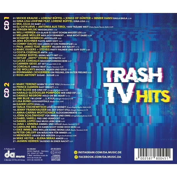 Beschreibung:Aufgehorcht liebe Trash-TV-Junkies! Hier kommt die ultimative Doppel-CD für alle, die Trash-Fernsehen lieben und fast schon 24/7 konsumieren. Egal, ob ihr Fans des "Dschungelcamps" oder von "Promi Big Brother", "Love Island" oder auch von "Schwiegertochter gesucht" seid. Vielleicht habt ihr auch alle Folgen von "Das große Promi-Büßen", "Frauentausch" oder vom "Sommerhaus der Stars" inhaliert oder ihr sucht Euren "Bachelor/Bachelorette"? Dann müsst ihr Euch diese CD unbedingt holen. Trashiger geh
