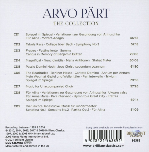 Disc 04 01. Ensemble Le Nuove Musiche "Magnificat" 02. Ensemble Le Nuove Musiche "Nunc dimittis (2001)" Magnificat-Antiphonen Nr. 1-7 03. Ensemble Le Nuove Musiche "Nr. 1 O Weisheit" 04. Ensemble Le Nuove Musiche "Nr. 2 O Adonai" 05. Ensemble Le Nuove Musiche "Nr. 3 O Spross aus Isaias Wurzel" 06. Ensemble Le Nuove Musiche "Nr. 4 O Schüssel Davids" 07. Ensemble Le Nuove Musiche "Nr. 5 O Morgenstern" 08. Ensemble Le Nuove Musiche "Nr. 6 O K?nig aller V?lker" 09. Ensemble Le Nuove Musiche "Nr. 7 O Immanuel" 10. Ensemble Le Nuove Musiche "Stabat Mater"