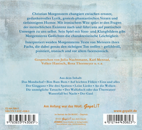 01. Szylowicki, Sonja "Ansage" 02. Schad, Stephan "Der Walfafisch Oder Das Ueberwasser" 03. Menrad, Karl "Auf Leichten Fuessen" 04. Nachtmann, Julia "Die Unmoegliche Tatsache" 05. Hanisch, Volker "Das Grosse Lalula" 06. Hoeffer, Donata "Das Aesthetische Wiesel" 07. Menrad, Karl "Der Zwoelf-Elf" 08. Schad, Stephan "Der Rabe Ralf" 09. Nachtmann, Julia "Der Sperling Und Das Kaenguruh" 10. Missler, Robert "Drei Hasen" 11. Rudolf, Christian "Das Heideschaf" 12. Schad, Stephan "Das Mondschaf" 13. Thormeyer, Rosa "Das Butterbrotpapier" 14. Minthe, Jonas "Traumwald" 15. Schad, Stephan "Gleich Einer Versunkenen Melodie" 16. Thormeyer, Rosa "Leise Lieder" 17. Nachtmann, Julia "Voeglein Schwermut" 18. Minthe, Jonas "Geier Schwermut" 19. Thormeyer, Rosa "Ein Wanderlied, Vom Abendwind Vertragen" 20. Kaminski, Stefan "Am Meer" 21. Menrad, Karl "Der Gingganz" 22. Schad, Stephan "Der Tanz" 23. Minthe, Jonas "Die Drei Spatzen" 24. Nachtmann, Julia "Denkmalswunsch" 25. Kaminski, Stefan "Moewenlied" 26. Elskis, Marion "Im Reich Der Interpunktionen" 27. Rudolf, Christian "Die Zwei Wurzeln" 28. Hanisch, Volker "Muhme Kunkel" 29. Menrad, Karl "Der Papagei" 30. Schad, Stephan "Bim Bam Bum" 31. Uter, Juergen "Der Schnupfen" 32. Reuters, Inga "Die Beichte Des Wurms" 33. Minthe, Jonas "Der Nachtschelm Und Das Siebenschwein Oder Eine Gl" 34. Menrad, Karl "Phanta's Schloss" 35. Nachtmann, Julia "An Die Wolken" 36. Thormeyer, Rosa "Knospe Des Lebens" 37. Minthe, Jonas "Kuerze" 38. Elskis, Marion "Der Gaul" 39. Menrad, Karl "Bundeslied Der Galgenbrueder" 40. Nachtmann, Julia "Die Behoerde" 41. Missler, Robert "Man Soll Sein Krankes Nierenbecken" 42. Elskis, Marion "Von Dem Grossen Elefanten" 43. Menrad, Karl "Die Naehe" 44. Nachtmann, Julia "Palmstroem" 45. Minthe, Jonas "Das Einhorn" 46. Nagel, Rolf "Herr Loeffel Und Frau Gabel" 47. Reuters, Inga "Die Beiden Esel" 48. Elskis, Marion "Der Huegel" 49. Thormeyer, Rosa "Von Den Heimlichen Rosen" 50. Menrad, Karl "Vormittag Am Strand" 51. Nachtmann, Julia "Meine Kunst" 52. Thormeyer, Rosa "Der Glaeserne Sarg" 53. Elskis, Marion "Mysterium" 54. Missler, Robert "Wein Und Waffe" 55. Menrad, Karl "Heut' Ritt Ich Im Traum" 56. Nachtmann, Julia "Das Grab Des Hunds" 57. Thormeyer, Rosa "Der Freie Geist" 58. Menrad, Karl "Eins Und Alles" 59. Nachtmann, Julia "Palma Kunkel" 60. Minthe, Jonas "Gebet" 61. Thormeyer, Rosa "An Meine Seele" 62. Leuenberger, Marie "Sternennacht" 63. Mues, Dietmar "Es Ist Nacht" 64. Nachtmann, Julia "Zum Abschied" 65. Thormeyer, Rosa "Wasserfall Bei Nacht" 66. Schad, Stephan "Meeresbrandung" 67. Elskis, Marion "Die Flamme" 68. Hanisch, Volker "Der Werwolf"