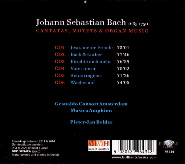 Disc 04 01. Doeselaar, Leo van "Pr?ludium und Fuge C-Dur BWV 545" Nimm von uns, Herr, du treuer Gott BWV 101 (Kantate) 02. Gesualdo Consort Amsterdam "Chor: Nimm von uns, Herr, du treuer Gott" 03. Gesualdo Consort Amsterdam "Arie: Handle nicht nach deinen Rechten" 04. Gesualdo Consort Amsterdam "Choral und Rezitativ: Ach! Herr Gott, durch die Treue dein" 05. Gesualdo Consort Amsterdam "Arie: Warum willst du so zornig sein?" 06. Gesualdo Consort Amsterdam "Choral und Rezitativ: Die Sünd hat uns verderbet sehr" 07. Gesualdo Consort Amsterdam "Arie (Duett): Gedenk an Jesu bittern Tod" 08. Gesualdo Consort Amsterdam "Choral: Leit uns mit deiner rechten Hand" 09. Zerer, Wolfgang "Vater unser im Himmelreich BWV 682" 10. Gesualdo Consort Amsterdam "Der Geist hilft unsrer Schwachheit auf BWV 226 (Motette)" 11. Zerer, Wolfgang "Vater unser im Himmelreich BWV 737 (Neumeister-Choral)" Herr, deine Augen sehen nach dem Glauben BWV 102 (Kantate) 12. Gesualdo Consort Amsterdam "Chor: Herr, deine Augen sehen nach dem Glauben" 13. Gesualdo Consort Amsterdam "Rezitativ: Wo ist das Ebenbild, das Gott uns eingepr?get" 14. Gesualdo Consort Amsterdam "Arie: Weh der Seele, die den Schaden" 15. Gesualdo Consort Amsterdam "Arioso: Verachtest du den Reichtum seiner Gnade" 16. Gesualdo Consort Amsterdam "Arie: Erschrecke doch du allzu sichre Seele" 17. Gesualdo Consort Amsterdam "Rezitativ: Beim Warten ist Gefahr" 18. Gesualdo Consort Amsterdam "Choral: Heut lebst du, heut bekehre dich" Pr?ludium und Fuge C-Dur BWV 545 (Auszug) 19. Zerer, Wolfgang "Fuge"