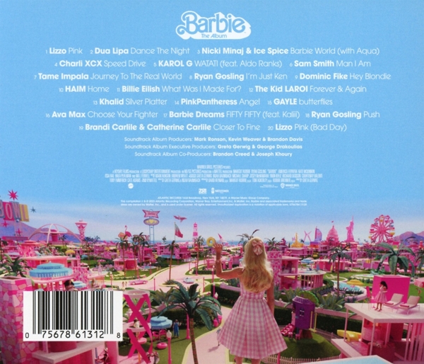 01. Lizzo "Pink" 02. Lipa, Dua "Dance The Night" 03. Minaj, Nicki / Ice Spice / Aqua "Barbie World" 04. Charli XCX "Speed Drive" 05. Karol G. / Ranks, Aldo "Watiti" 06. Smith, Sam "Man I Am" 07. Tame Impala "Journey To The Real World" 08. Gosling, Ryan "I'm Just Ken" 09. Fike, Dominic "Hey Blondie" 10. Haim "Home" 11. Eilish, Billie "What Was I Made For" 12. Kid Laroi, The "Forever & Again" 13. Khalid "Silver Platter" 14. Pink Pantheress "Angel" 15. Gayle "Butterflies" 16. Max, Ava "Choose Your Fighter" 17. Barbie Dreams / Kaliii "Fifty Fifty" 18. Gosling, Ryan "Push" 19. Carlile, Brandi / Carlile, Catherine "Closer to fine" 20. Lizzo "Pink (Bad day)"