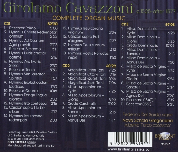 | Beschreibung: | Born in northern Italy around the turn of the 16th century - no more precise data is available - Girolamo Cavazzoni became organist of the cathedral in Mantova in 1621 and soon after entered the service of the Gonzaga family whose lavish artistic patronage sponsored and encouraged many of the finest Italian composers of the day. During his Mantuan years Cavazzoni taught the organ to Costanzo Antegnati (1549-1624), son of the organ builder at S Barbara, Graziadio Antegnati. Costanzo's L'arte organica (Brescia, 1608) recalls Cavazzoni as 'Hieronimo d'Urbino già mio honorato maestro'. In 1565-6 he supervised the building of the organ in the church of S Barbara, Mantua, and also played the organ there at Mass. This is the very instrument played by Federico Del Sordo, lending his recording a unique authenticity and powerful sense of place and time. The restoration of the single-manual Santa Barbara organ (1995-2006) was undertaken by Giorgio Carli with the aim of returning the instrument to it's original pristine state as far as possible, rather than extending or 'improving' it, and thus the colors of the instrument closely resemble those with which Cavazzoni was familiar. Much of the music here was written for liturgical performance in the alternatim fashion, whereby verses of the Mass text, the Magnificat or an antiphon are alternatively played and embroidered by the organ and then chanted by a choir. Federico Del Sordo draws on two original volumes, printed in Venice in the 1540s, plus a pair of ricercars to be found in multi-authored collections of the time. Together they build a portrait of a composer as stylish as he was pragmatic., Runningtime: 00:00:00, Choir: Nova Schola Gregoriana, Composed By: Girolamo Cavazzoni, Directed By: Alberto Turco, Liner Notes: Federico Del Sordo, Liner Notes [Translation By]: Kate Singleton, Organ: Federico Del Sordo, Recorded By, Edited By, Mastered By: Federico Del Sordo, Labelcode BRLT96192.2 (96192), Phonographic Copyright (p) Brilliant Classics, Copyright (c) Brilliant Classics |
