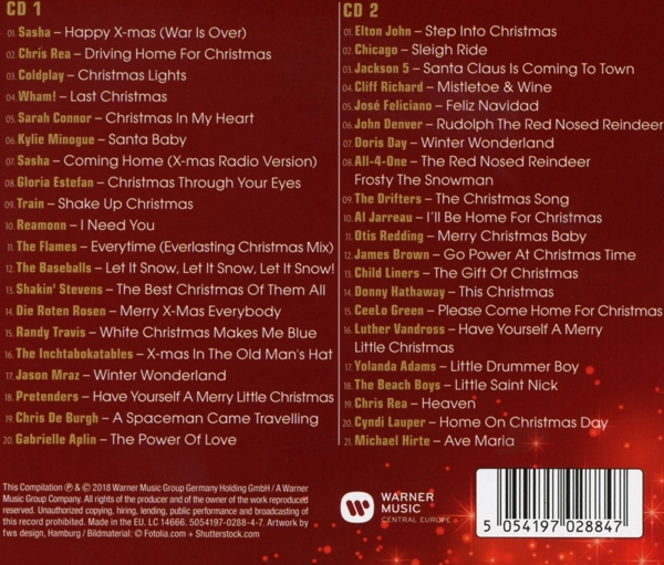 Disc 01 01. Sasha "Happy X-mas (War is over)" 02. Rea, Chris "Driving home for Christmas" 03. Coldplay "Christmas lights" 04. Wham! "Last Christmas" 05. Connor, Sarah "Christmas in my heart" 06. Minouge, Kylie "Santa baby" 07. Sasha "Coming home (X-mas Radio Version)" 08. Estefan, Gloria "Christmas through your eyes" 09. Train "Shake up Christmas" 10. Reamonn "I need you" 11. Flames, The "Everytime" 12. Baseballs, The "Let it snow" 13. Shakin' Stevens "The best Christmas of them all" 14. Roten Rosen, Die "Merry X-Mas everybody" 15. Travis, Randy "White Christmas makes me blue" 16. Inchtabokatables, The "X-mas in the old man's hat" 17. Mramz, Jason "Winter wonderland" 18. Pretenders "Have yourself a Merry little Christmas" 19. De Burgh, Chris "A spaceman came travelling" 20. Aplin, Gabrielle "The power of love"