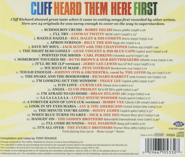 | | Beschreibung: | Compiled By, Liner Notes: Tony Rounce, Design [Package Designed By]: Paul Jeffrey (2), Mastered By: Duncan Cowell, Labelcode ACI6705332.2 (CDCHD 1359), Mastered At Sound Mastering Ltd, Licensed To Ace Records Ltd., Phonographic Copyright (p) Ace Records Ltd., Copyright (c) Ace Records Ltd., Duplicated By Sound Performance |  | | Produzent: |