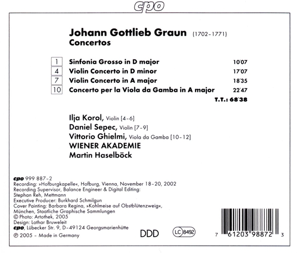 Sinfonie für 2 Fl?ten, 2 Oboen, 2 Fagotte, 2 H?rner, 3 Tompeten, Pauken Streicher und Basso continuo D-Dur 01. Orchester Wiener Akademie "1. Allegro maestoso" 02. Orchester Wiener Akademie "2. Arietta: Grazioso" 03. Orchester Wiener Akademie "3. Allegro scherzando" Konzert für 3 Violinen, Viola und Basso continuo d-moll 04. Korol, Ilja "1. Allegro" 05. Korol, Ilja "2. Adagio" 06. Korol, Ilja "3. Allegro assai" Konzert für 3 Violinen, Viola und Basso continuo A-Dur 07. Sepec, Daniel "1. Allegretto" 08. Sepec, Daniel "2. Largo" 09. Sepec, Daniel "3. Allegro" Konzert für Viola da Gamba, 2 Violinen, Viola und Basso continuo A-Dur 10. Ghielmi, Vittorio "1. Allegretto" 11. Ghielmi, Vittorio "2. Adagio" 12. Ghielmi, Vittorio "3. Allegro"