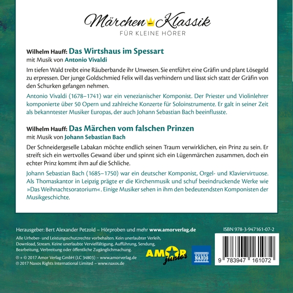 01. Fehn, Gerhard / Zamperoni, Luca / Bergmann, Christian / Thiede, Marvin / Schwarz, Emil / +++ "Das unsichtbare Wirtshaus (Fl?tenkonzert nr. 2, die Nacht)" 02. Fehn, Gerhard / Zamperoni, Luca / Bergmann, Christian / Thiede, Marvin / Schwarz, Emil / +++ "Die R?uber kommen (Die vier Jahreszeiten, der Sommer)" 03. Fehn, Gerhard / Zamperoni, Luca / Bergmann, Christian / Thiede, Marvin / Schwarz, Emil / +++ "Die falsche Gr?fin (Die vier Jahreszeiten, der Herbst)" 04. Fehn, Gerhard / Zamperoni, Luca / Bergmann, Christian / Thiede, Marvin / Schwarz, Emil / +++ "Im Versteck der R?uber (Fagottkonzert in a-Moll)" 05. Fehn, Gerhard / Zamperoni, Luca / Bergmann, Christian / Thiede, Marvin / Schwarz, Emil / +++ "Warten auf L?segeld (Oboenkonzert in a-Moll)" 06. Fehn, Gerhard / Zamperoni, Luca / Bergmann, Christian / Thiede, Marvin / Schwarz, Emil / +++ "Der Plan des R?uberhauptmanns (Konzert für Altfl?te in C-Dur)" 07. Fehn, Gerhard / Zamperoni, Luca / Bergmann, Christian / Thiede, Marvin / Schwarz, Emil / +++ "Flucht durch den Wald (Die vier Jahreszeiten, der Frühling)" 08. Fehn, Gerhard / Zamperoni, Luca / Bergmann, Christian / Thiede, Marvin / Schwarz, Emil / +++ "Die liebste Patentante (Doppelkonzert für Trompete in C-Dur)" 09. Hamer, Antje / Thiede, Marvin / Weber, Dominik-Paul / Bergmann, Christian / Schwarz, Emil / +++ "Labakans Traum (Doppelkonzert für 2 Violinen in d-Moll)" 10. Hamer, Antje / Thiede, Marvin / Weber, Dominik-Paul / Bergmann, Christian / Schwarz, Emil / +++ "Im Gewand eines Prinzen (Cembalokonzert nr 12, allegro)" 11. Hamer, Antje / Thiede, Marvin / Weber, Dominik-Paul / Bergmann, Christian / Schwarz, Emil / +++ "Unterwegs im Land als Adliger (Wachet auf, ruft uns die Stimme)" 12. Hamer, Antje / Thiede, Marvin / Weber, Dominik-Paul / Bergmann, Christian / Schwarz, Emil / +++ "Das Geheimnis von Prinz Omar (Doppelkonzert für Violine, Oboe und Orchester, adagio)" 13. Hamer, Antje / Thiede, Marvin / Weber, Dominik-Paul / Bergmann, Christian / Schwarz, Emil / +++ "Ein falscher und ein wahrer Sohn (Das wolhtemperierte Klavier, Pr?ludium und Fuge in c-Moll)" 14. Hamer, Antje / Thiede, Marvin / Weber, Dominik-Paul / Bergmann, Christian / Schwarz, Emil / +++ "Die misstrauische Fürstin (Toccata und Fuge in d-Moll)" 15. Hamer, Antje / Thiede, Marvin / Weber, Dominik-Paul / Bergmann, Christian / Schwarz, Emil / +++ "Das Geschenk der Fee (Orchestersuite nr. 3)" 16. Hamer, Antje / Thiede, Marvin / Weber, Dominik-Paul / Bergmann, Christian / Schwarz, Emil / +++ "Der echte Prinzensohn! (Das Weihnachtsoratorium, Jauchzet, frohlocket)"