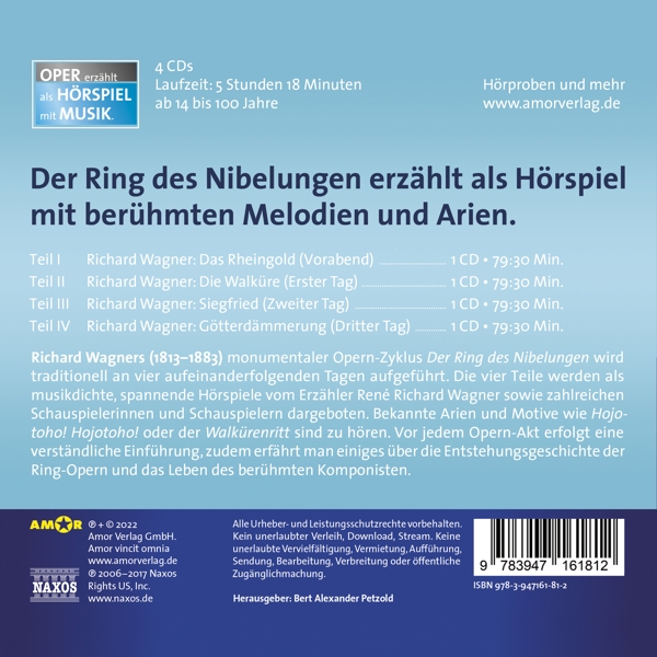 Disc 01 01. Wagner, Ren? Richard / Zamperoni, Luca / Lachnitt, Ina / Lütgenhorst, David / Hardegen, Dirk / +++ "Vorspiel (Instrumental)" 02. Wagner, Ren? Richard / Zamperoni, Luca / Lachnitt, Ina / Lütgenhorst, David / Hardegen, Dirk / +++ "Richard Wagner: Das Rheingold. Vorgeschichte - Vorspiel" 03. Wagner, Ren? Richard / Zamperoni, Luca / Lachnitt, Ina / Lütgenhorst, David / Hardegen, Dirk / +++ "Einführung. Erste Szene." 04. Wagner, Ren? Richard / Zamperoni, Luca / Lachnitt, Ina / Lütgenhorst, David / Hardegen, Dirk / +++ "Weia! Waga! Woge du Welle!" 05. Wagner, Ren? Richard / Zamperoni, Luca / Lachnitt, Ina / Lütgenhorst, David / Hardegen, Dirk / +++ "Erste Szene. Spielszene. Auf dem Grund des Rheins [Teil 1]" 06. Wagner, Ren? Richard / Zamperoni, Luca / Lachnitt, Ina / Lütgenhorst, David / Hardegen, Dirk / +++ "Hehe! Ihr Nicker - Auf dem Grund des Rheins [Teil 2]" 07. Wagner, Ren? Richard / Zamperoni, Luca / Lachnitt, Ina / Lütgenhorst, David / Hardegen, Dirk / +++ "Garstig glatter glitschiger Glimmer" 08. Wagner, Ren? Richard / Zamperoni, Luca / Lachnitt, Ina / Lütgenhorst, David / Hardegen, Dirk / +++ "Erste Szene. Spielszene. Auf dem Grund des Rheins [Teil 3]" 09. Wagner, Ren? Richard / Zamperoni, Luca / Lachnitt, Ina / Lütgenhorst, David / Hardegen, Dirk / +++ "Erste Szene. Spielszene. Auf dem Grund des Rheins [Teil 4]" 10. Wagner, Ren? Richard / Zamperoni, Luca / Lachnitt, Ina / Lütgenhorst, David / Hardegen, Dirk / +++ "Der Welt Erbe gewann' ich zu eigen durch dich - Haltet den R?uber! - Erste Szene. Spielszene. Auf dem Grund des Rheins.." 11. Wagner, Ren? Richard / Zamperoni, Luca / Lachnitt, Ina / Lütgenhorst, David / Hardegen, Dirk / +++ "Erste Szene. Spielszene. Auf dem Grund des Rheins [Teil 6]" 12. Wagner, Ren? Richard / Zamperoni, Luca / Lachnitt, Ina / Lütgenhorst, David / Hardegen, Dirk / +++ "Erste Szene. Spielszene. Auf dem Grund des Rheins [Teil 7]" 13. Wagner, Ren? Richard / Zamperoni, Luca / Lachnitt, Ina / Lütgenhorst, David / Hardegen, Dirk / +++ "Einleitung (Instrumental) - Einführung. Zweite Szene" 14. Wagner, Ren? Richard / Zamperoni, Luca / Lachnitt, Ina / Lütgenhorst, David / Hardegen, Dirk / +++ "Zweite Szene. Spielszene. Freie Gegend auf Bergesh?hen [Teil 1]" 15. Wagner, Ren? Richard / Zamperoni, Luca / Lachnitt, Ina / Lütgenhorst, David / Hardegen, Dirk / +++ "Sanft schloss Schlaf dein Aug'!" 16. Wagner, Ren? Richard / Zamperoni, Luca / Lachnitt, Ina / Lütgenhorst, David / Hardegen, Dirk / +++ "Zweite Szene. Spielszene. Freie Gegend auf Bergesh?hen [Teil 2]" 17. Wagner, Ren? Richard / Zamperoni, Luca / Lachnitt, Ina / Lütgenhorst, David / Hardegen, Dirk / +++ "Schwester! Brüder! Rettet! - Zweite Szene. Spielszene. Freie Gegend auf Bergesh?hen [Teil 3]" 18. Wagner, Ren? Richard / Zamperoni, Luca / Lachnitt, Ina / Lütgenhorst, David / Hardegen, Dirk / +++ "Zweite Szene. Spielszene. Freie Gegend auf Bergesh?hen [Teil 4]" 19. Wagner, Ren? Richard / Zamperoni, Luca / Lachnitt, Ina / Lütgenhorst, David / Hardegen, Dirk / +++ "Einführung. Dritte Szene - Verwandlungsmusik" 20. Wagner, Ren? Richard / Zamperoni, Luca / Lachnitt, Ina / Lütgenhorst, David / Hardegen, Dirk / +++ "In Nibelheim. Hehe! Hehe! Hieher! Hieher! - Dritte Szene. Spielszene. In Nibelheim [Teil 1]" 21. Wagner, Ren? Richard / Zamperoni, Luca / Lachnitt, Ina / Lütgenhorst, David / Hardegen, Dirk / +++ "Dritte Szene. Spielszene. In Nibelheim [Teil 2]" 22. Wagner, Ren? Richard / Zamperoni, Luca / Lachnitt, Ina / Lütgenhorst, David / Hardegen, Dirk / +++ "Nibelheim hier: durch bleiche Nebel" 23. Wagner, Ren? Richard / Zamperoni, Luca / Lachnitt, Ina / Lütgenhorst, David / Hardegen, Dirk / +++ "Dritte Szene. Spielszene. In Nibelheim [Teil 3]" 24. Wagner, Ren? Richard / Zamperoni, Luca / Lachnitt, Ina / Lütgenhorst, David / Hardegen, Dirk / +++ "Ohe! Ohe! Schreckliche Schlange" 25. Wagner, Ren? Richard / Zamperoni, Luca / Lachnitt, Ina / Lütgenhorst, David / Hardegen, Dirk / +++ "Dritte Szene. Spielszene. In Nibelheim [Teil 4]" 26. Wagner, Ren? Richard / Zamperoni, Luca / Lachnitt, Ina / Lütgenhorst, David / Hardegen, Dirk / +++ "Dort, die Kr?te! Greife sie rasch!" 27. Wagner, Ren? Richard / Zamperoni, Luca / Lachnitt, Ina / Lütgenhorst, David / Hardegen, Dirk / +++ "Dritte Szene. Spielszene. In Nibelheim [Teil 5] - Dort, die Kr?te! Greife sie rasch!" 28. Wagner, Ren? Richard / Zamperoni, Luca / Lachnitt, Ina / Lütgenhorst, David / Hardegen, Dirk / +++ "Einführung. Vierte Szene" 29. Wagner, Ren? Richard / Zamperoni, Luca / Lachnitt, Ina / Lütgenhorst, David / Hardegen, Dirk / +++ "Ist er gel?st? - Vierte Szene. Spielszene. Freie Gegend auf Bergesh?hen [Teil 1]" 30. Wagner, Ren? Richard / Zamperoni, Luca / Lachnitt, Ina / Lütgenhorst, David / Hardegen, Dirk / +++ "Ist er gel?st?" 31. Wagner, Ren? Richard / Zamperoni, Luca / Lachnitt, Ina / Lütgenhorst, David / Hardegen, Dirk / +++ "Vierte Szene. Spielszene. Freie Gegend auf Bergesh?hen [Teil 2]" 32. Wagner, Ren? Richard / Zamperoni, Luca / Lachnitt, Ina / Lütgenhorst, David / Hardegen, Dirk / +++ "Wieche Wotan weiche!" 33. Wagner, Ren? Richard / Zamperoni, Luca / Lachnitt, Ina / Lütgenhorst, David / Hardegen, Dirk / +++ "Vierte Szene. Spielszene. Freie Gegend auf Bergesh?hen [Teil 3]" 34. Wagner, Ren? Richard / Zamperoni, Luca / Lachnitt, Ina / Lütgenhorst, David / Hardegen, Dirk / +++ "Vierte Szene. Spielszene. Freie Gegend auf Bergesh?hen [Teil 4]" 35. Wagner, Ren? Richard / Zamperoni, Luca / Lachnitt, Ina / Lütgenhorst, David / Hardegen, Dirk / +++ "Bruder hieher! Weise der Brücke den Weg! - Vierte Szene. Spielszene. Freie Gegend auf Bergesh?hen [Teil 5]" 36. Wagner, Ren? Richard / Zamperoni, Luca / Lachnitt, Ina / Lütgenhorst, David / Hardegen, Dirk / +++ "Bruder hieher! Weise der Brücke den Weg! - Vierte Szene. Spielszene. Freie Gegend auf Bergesh?hen [Teil 6]" 37. Wagner, Ren? Richard / Zamperoni, Luca / Lachnitt, Ina / Lütgenhorst, David / Hardegen, Dirk / +++ "Rheingold! Rheingold! Reines Gold!" 38. 