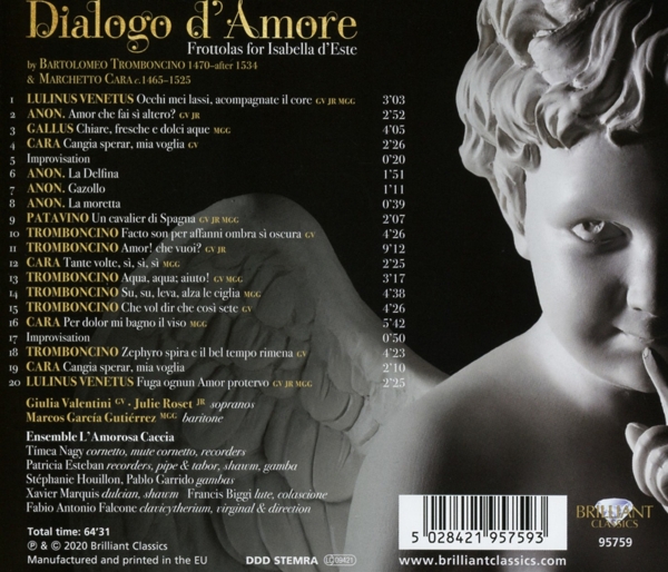 01. Valentini, Giulia "Occhi mei lassi, acompagnate il core" 02. Valentini, Giulia "Amor che fai s altero?" 03. Guti?rrez, Marcos Garc¡a "Chiare, fresche e dolci aque" 04. Valentini, Giulia "Cangia sperar, mia voglia" 05. L'Amorosa Caccia "Improvisation" 06. L'Amorosa Caccia "La Delfina" 07. L'Amorosa Caccia "Gazollo" 08. L'Amorosa Caccia "La moretta" 09. Valentini, Giulia "Un cavalier di Spagna" 10. Valentini, Giulia "Facto son per affanni ombra s oscura" 11. Valentini, Giulia "Amor! che vuoi?" 12. Guti?rrez, Marcos Garc¡a "Tante volte, s, s, s" 13. Valentini, Giulia "Aqua, aqua, aiuto!" 14. Guti?rrez, Marcos Garc¡a "Su, su, leva, alza le ciglia" 15. Valentini, Giulia "Che vol dir che cos sete" 16. Guti?rrez, Marcos Garc¡a "Per dolor mi bagno il viso" 17. L'Amorosa Caccia "Improvisation" 18. Valentini, Giulia "Zephyro spira e il bel tempo rimena" 19. L'Amorosa Caccia "Cangia sperar, mi voglia" 20. Valentini, Giulia "Fuga ognun Amor protervo"