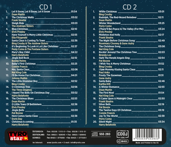 Disc 01 01. Martin, Dean "Let It Snow, Let It Snow, Let It Snow" 02. Sinatra, Frank "The Christmas Waltz" 03. Andrews Sisters, The "Sleigh Ride" 04. Presley, Elvis "Blue Christmas" 05. Fitzgerald, Ella "Have Yourself A Merry Little Christmas" 06. Bing Crosby & The Andrew Sisters "Santa Claus Is Coming To Town" 07. Perry Como & The Fontane Sisters "It's Beginning To Look A Lot Like Christmas" 08. Belafonte, Harry "Mary's Boy Child" 09. Helms, Bobby "Jingle Bell Rock" 10. Francis, Connie "Baby's First Christmas" 11. Cole, Nat King "Mrs. Santa Claus" 12. Mathis, Johnny "I'll Be Home For Christmas" 13. Crosby, Bing "The Little Drummer Boy" 14. Three Degrees, The "O Christmas Tree" 15. Belafonte, Harry "I Heard The Bells On Christmas Day" 16. Martin, Dean "The Christmas Blues" 17. Presley, Elvis "O Little Town Of Bethlehem" 18. Boone, Pat "Jingle Bells" 19. Day, Doris "Here Comes Santa Claus" 20. Belafonte, Harry "Christmas is coming"